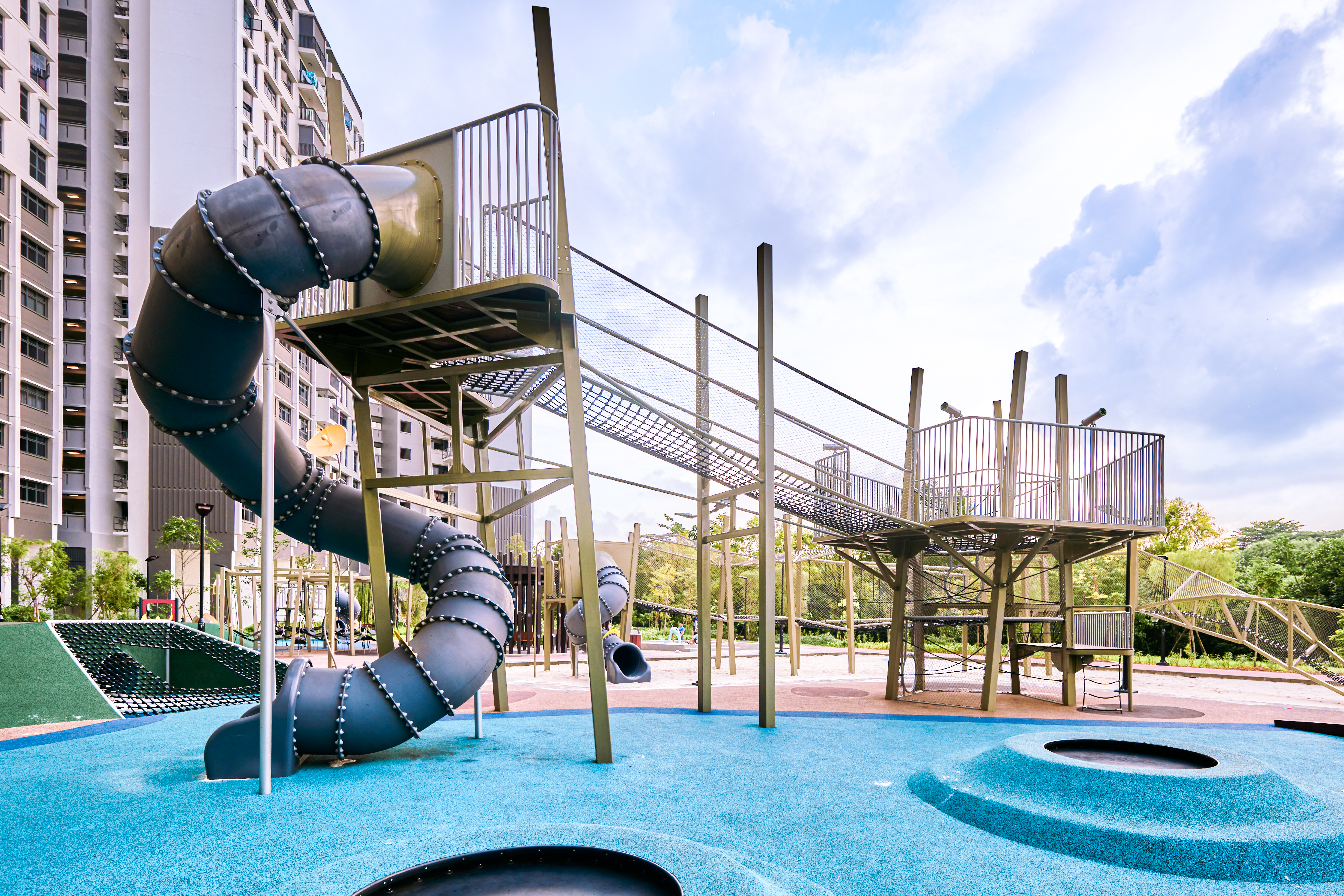 The structure incorporates multiple climbing routes, net bridges connecting platforms, and a tall spiral slide for exhilarating descents. Its elevated design promotes spatial awareness, teamwork, and imaginative play, making it a hub for children of all ages to gather, climb, and explore together.