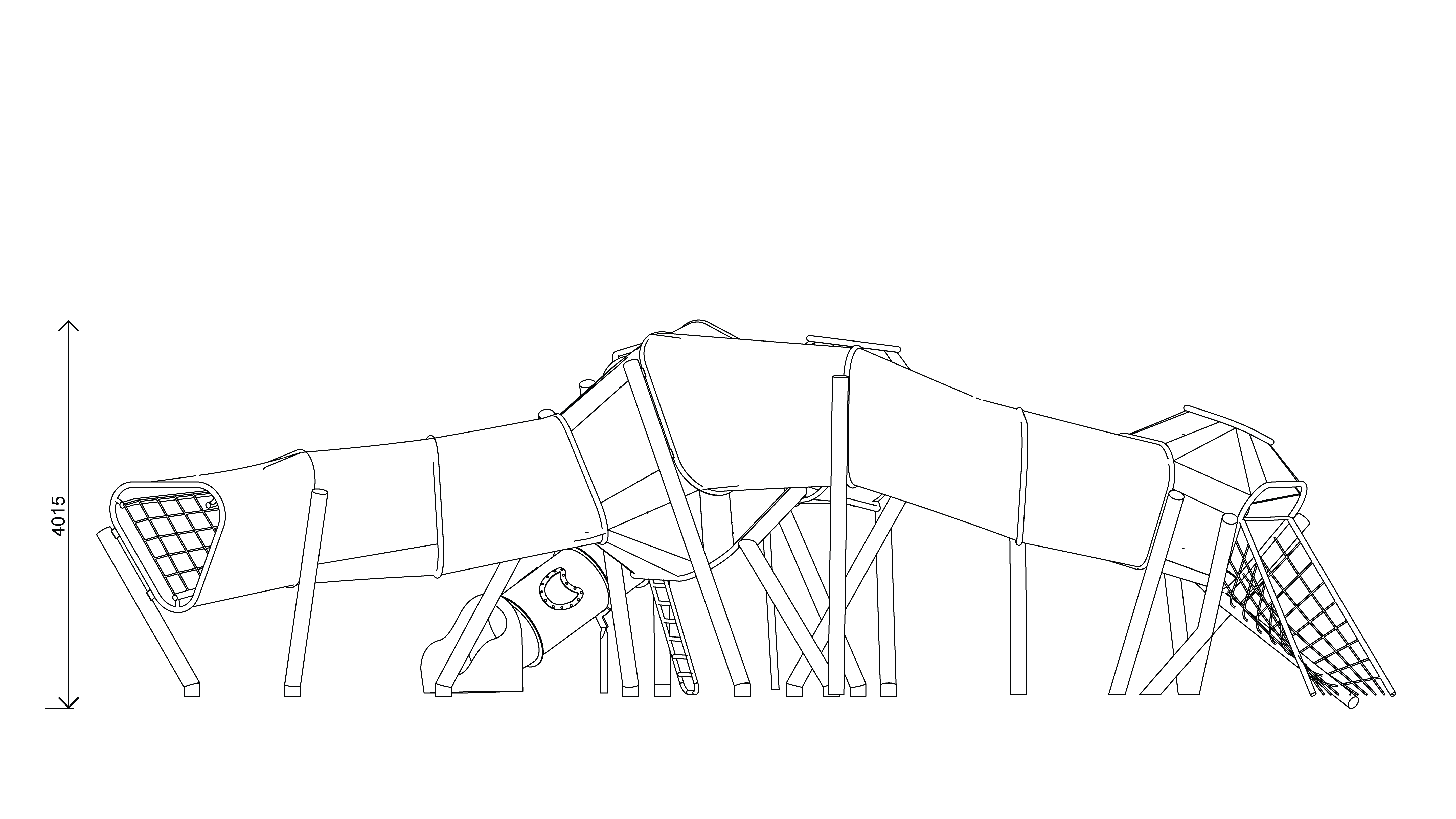 The Climbing Parcour is an elevated adventure playground designed to challenge agility, strength, and imagination. Rising nearly five meters above ground, it features interconnected cocoon pods that serve as crossing points, lounging areas, and lookout platforms all at once. The pods are linked by dynamic climbing tunnels that curve in a figure-eight formation, offering multiple entry and exit points. With varying heights and routes, the structure invites children of all ages to explore at their own pace. By elevating the play system, the footprint on the ground is minimized, leaving the space below open and accessible.
