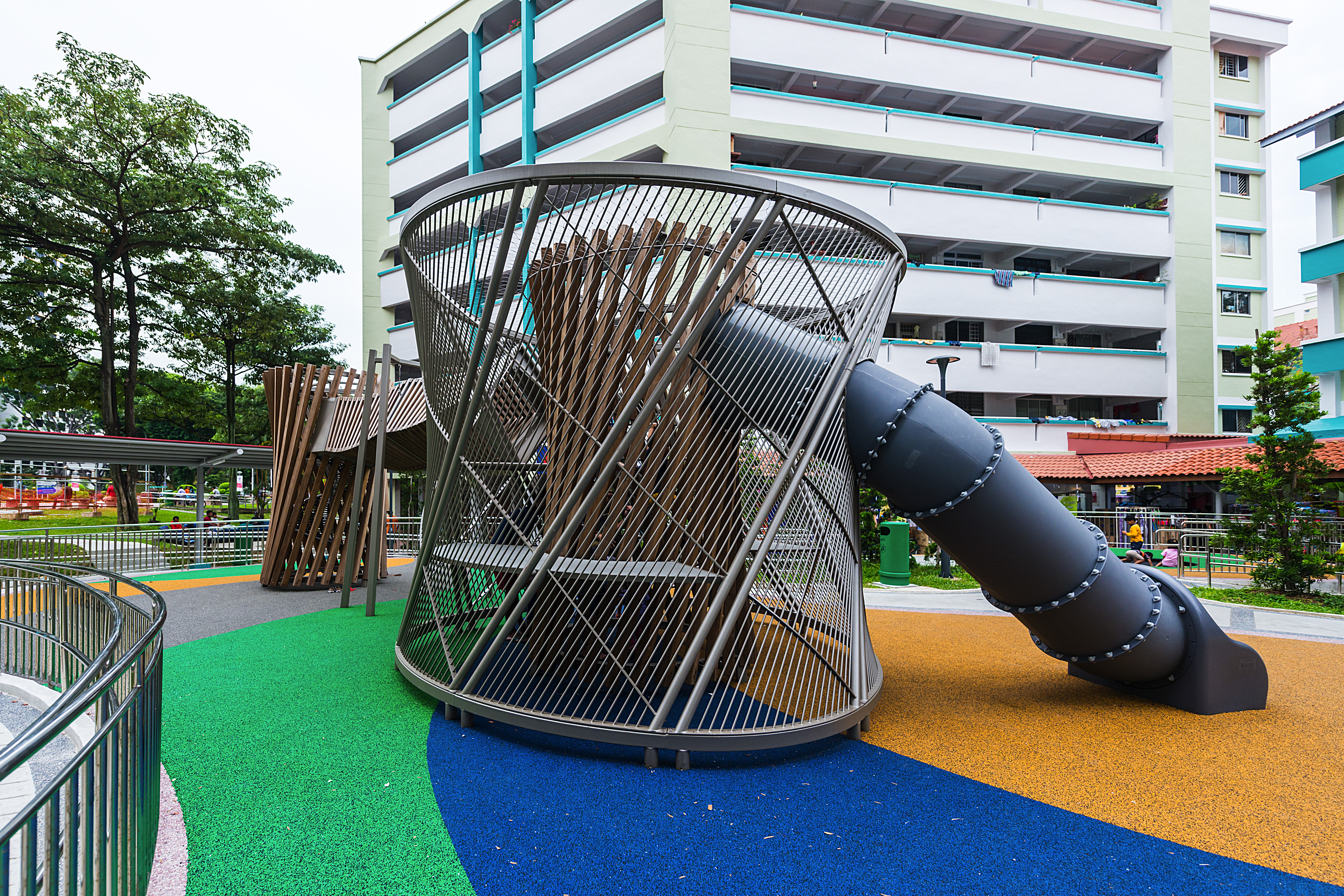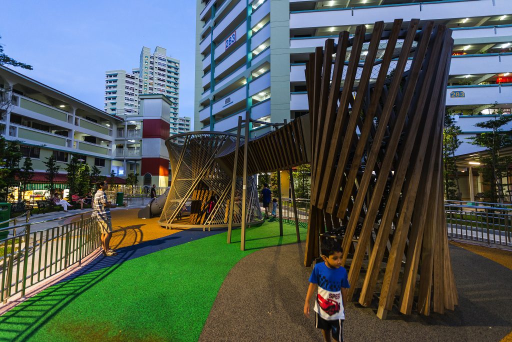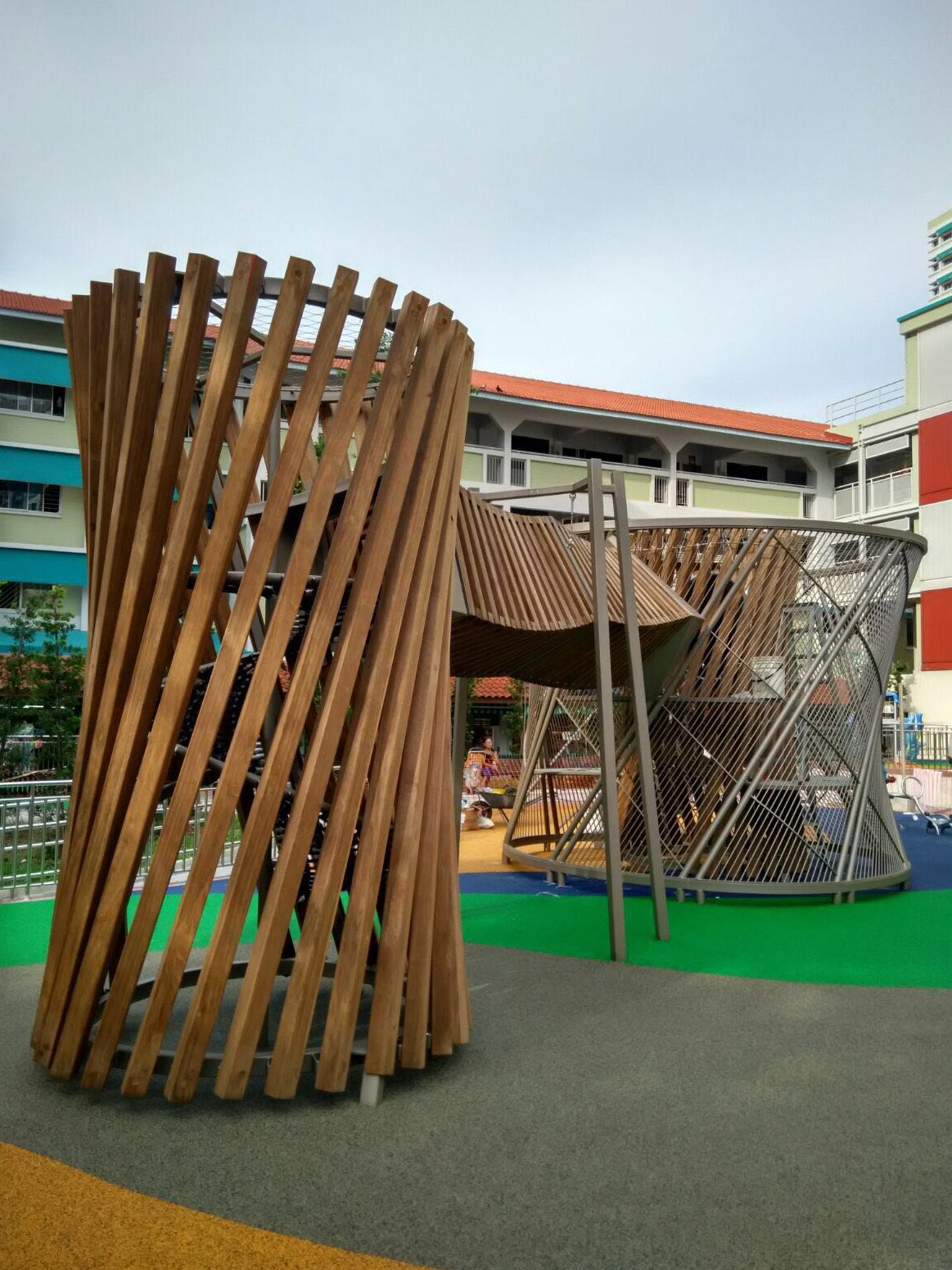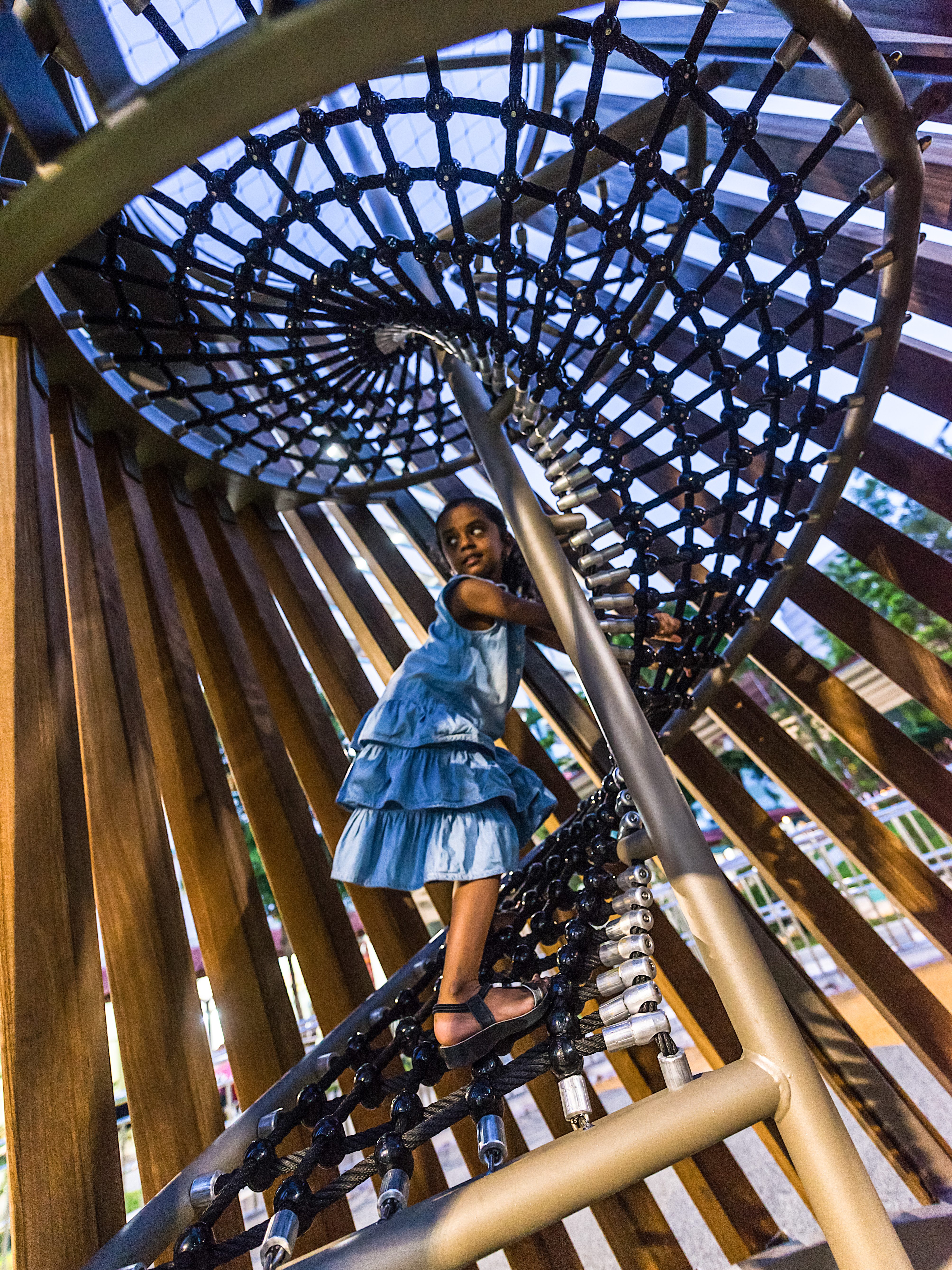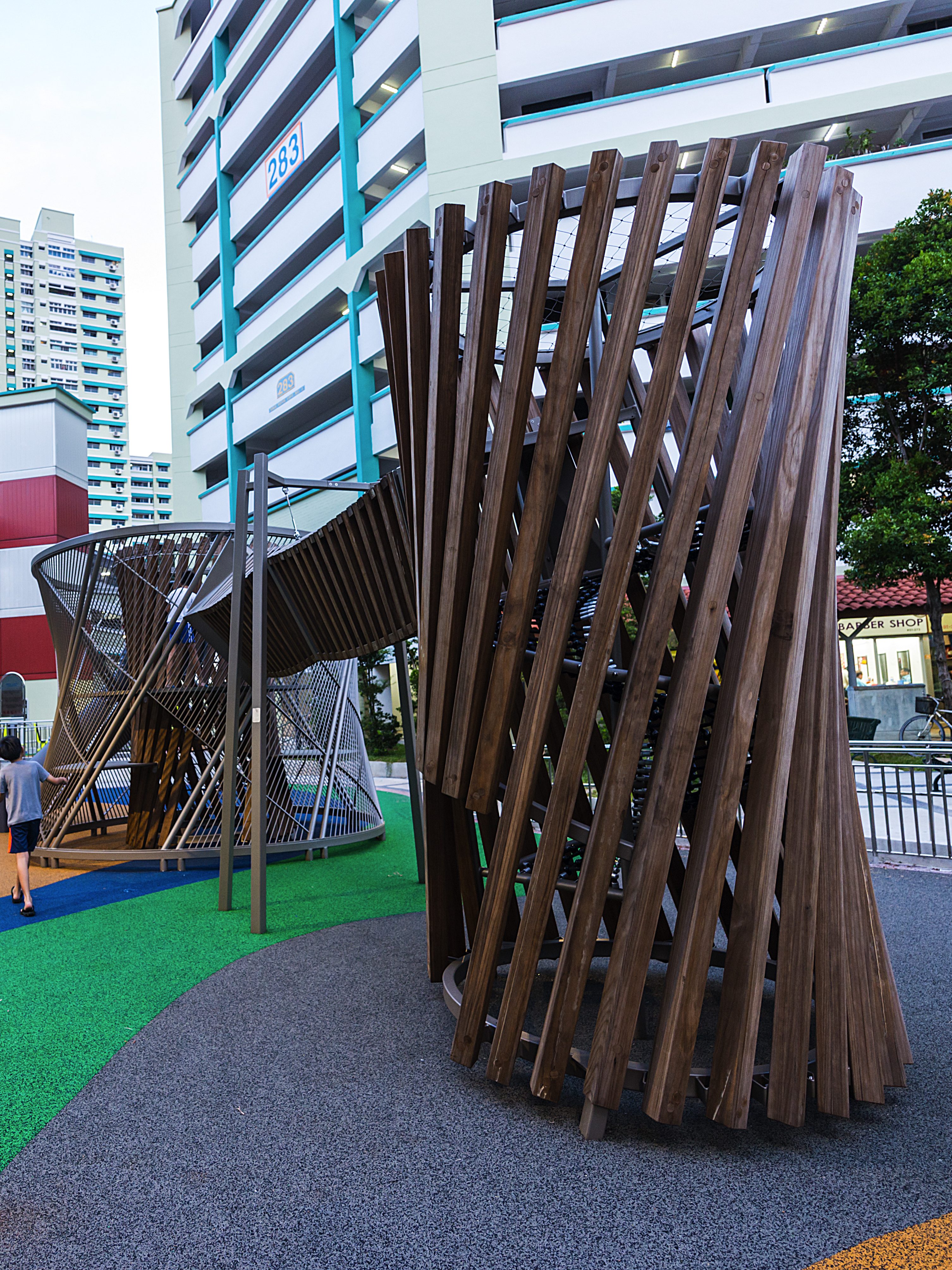 The design features twisted vertical towers clad with timber beams, offering a semi-transparent facade that intrigues children to look inside. Inside, multiple climbing paths with varying challenges encourage both physical skill and decision-making. Platforms and ropes create layered routes, ensuring that each climb feels unique. Together, the towers balance architectural beauty with adventurous play, providing a landmark structure that is as visually striking as it is engaging for children.