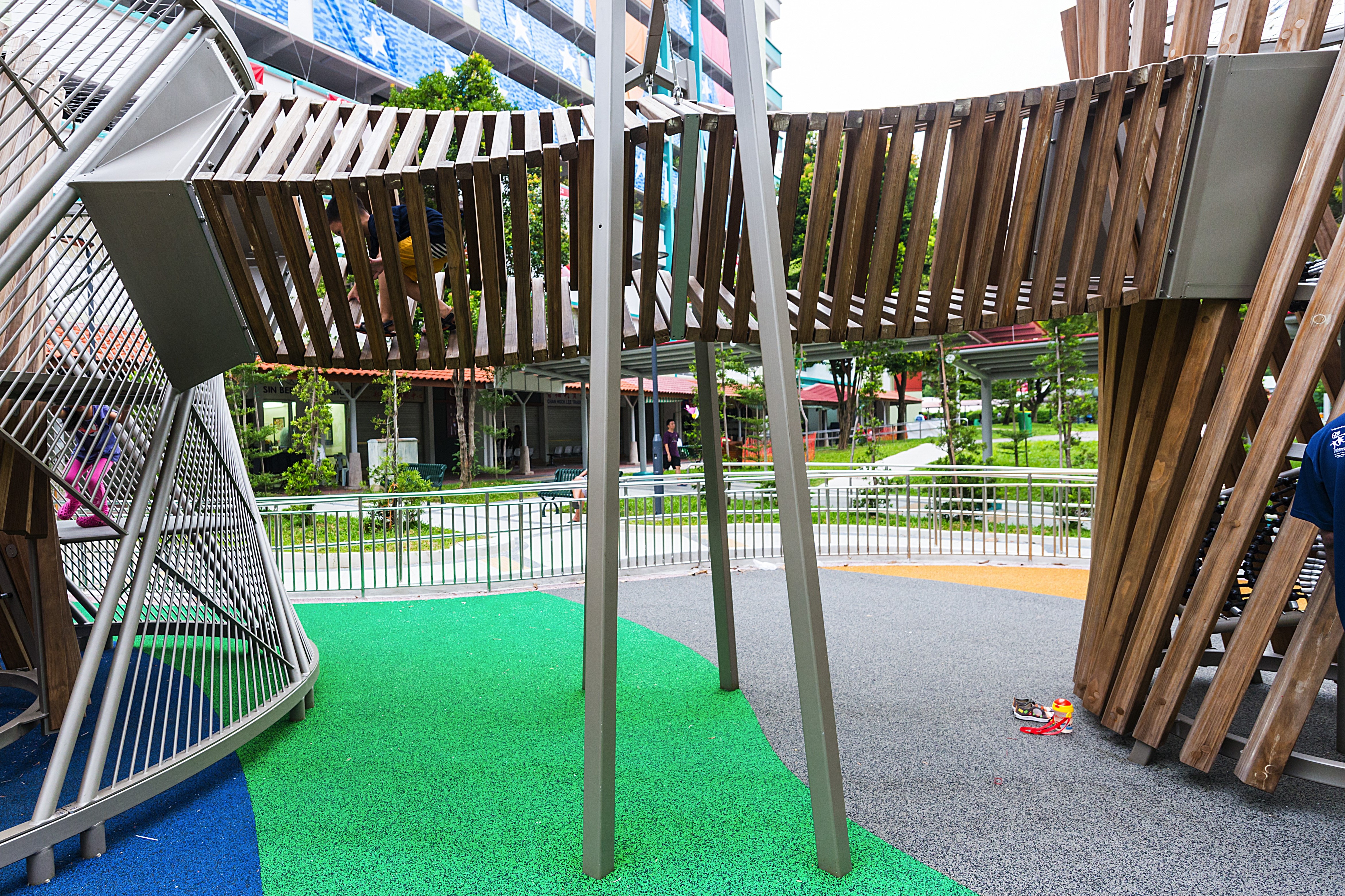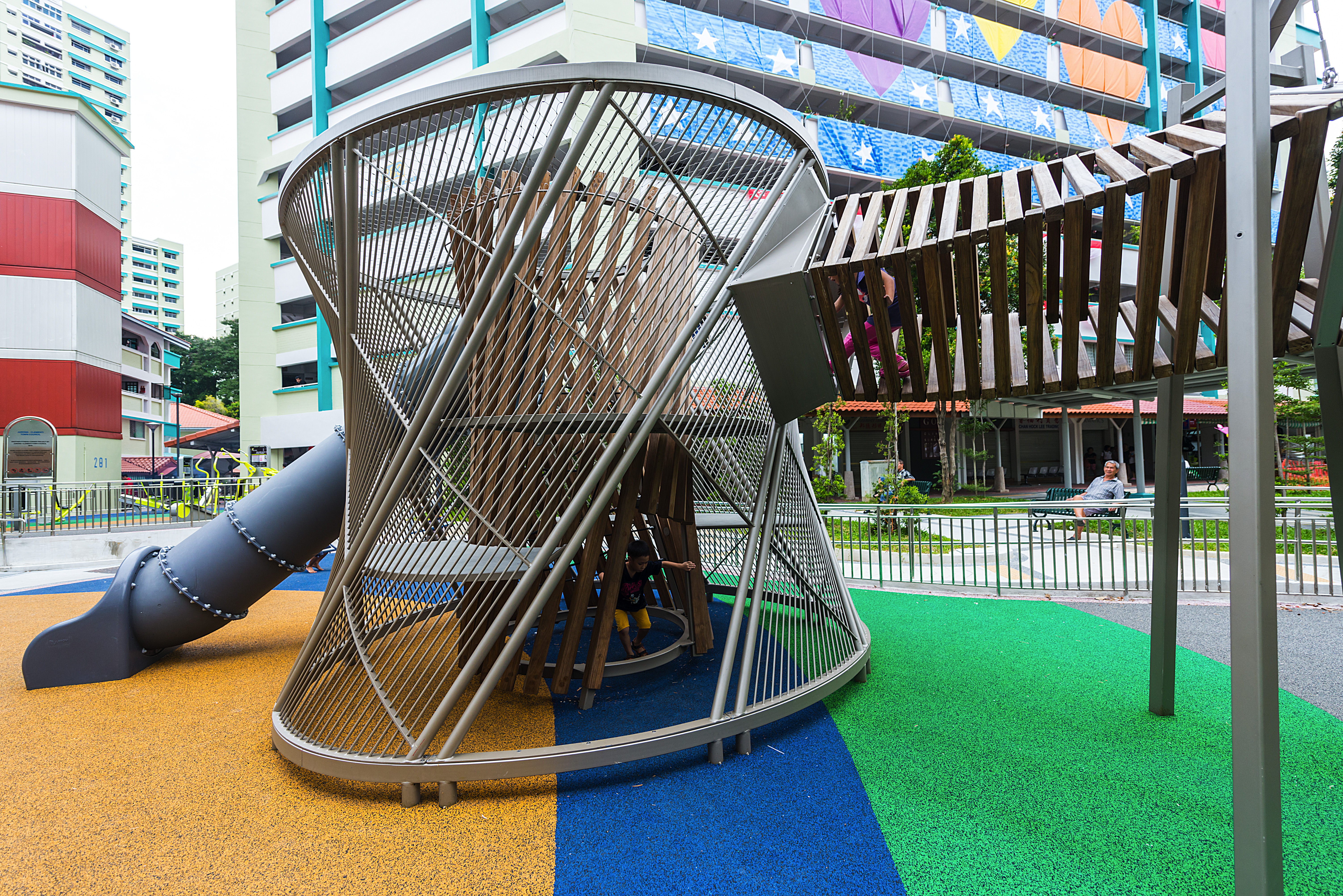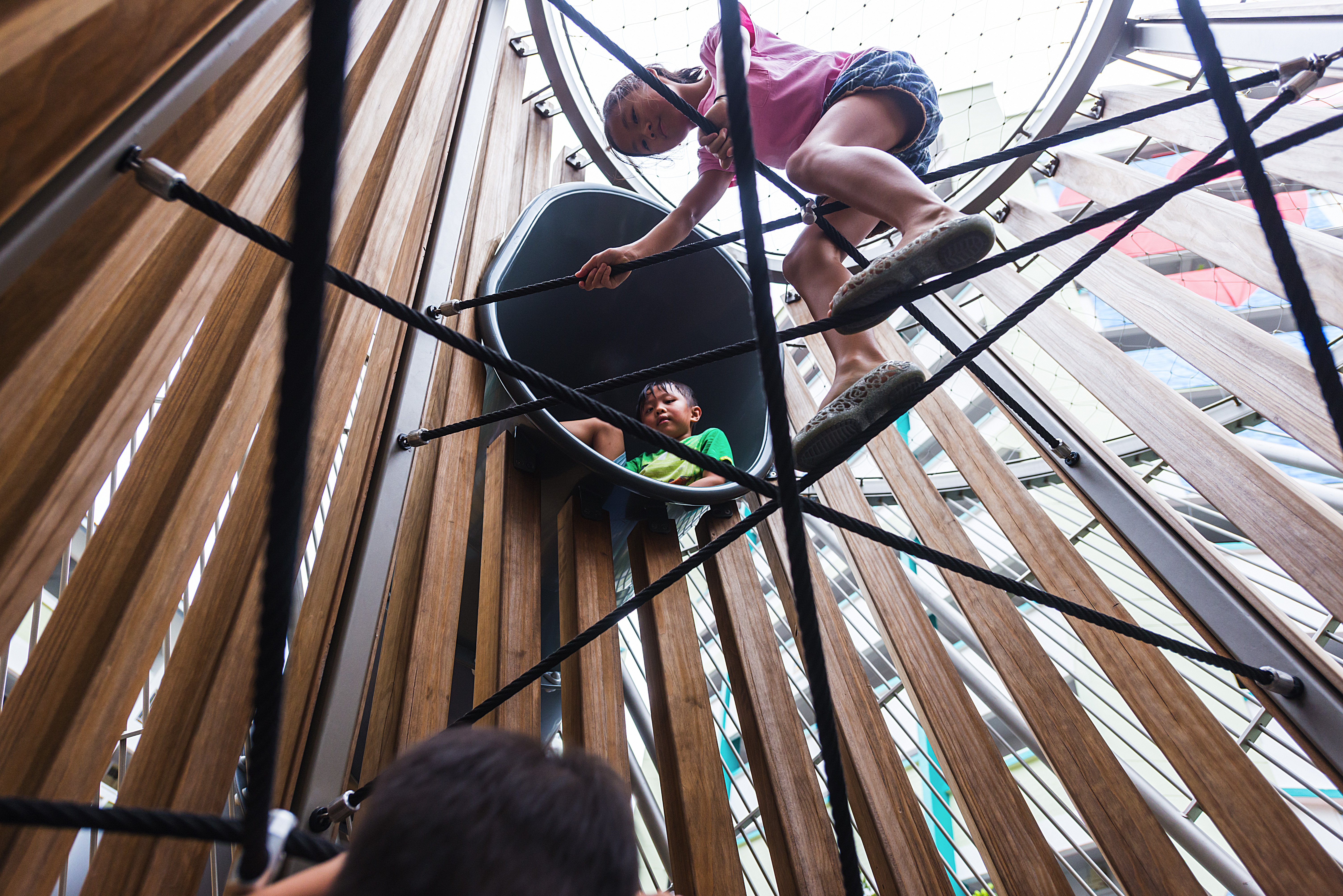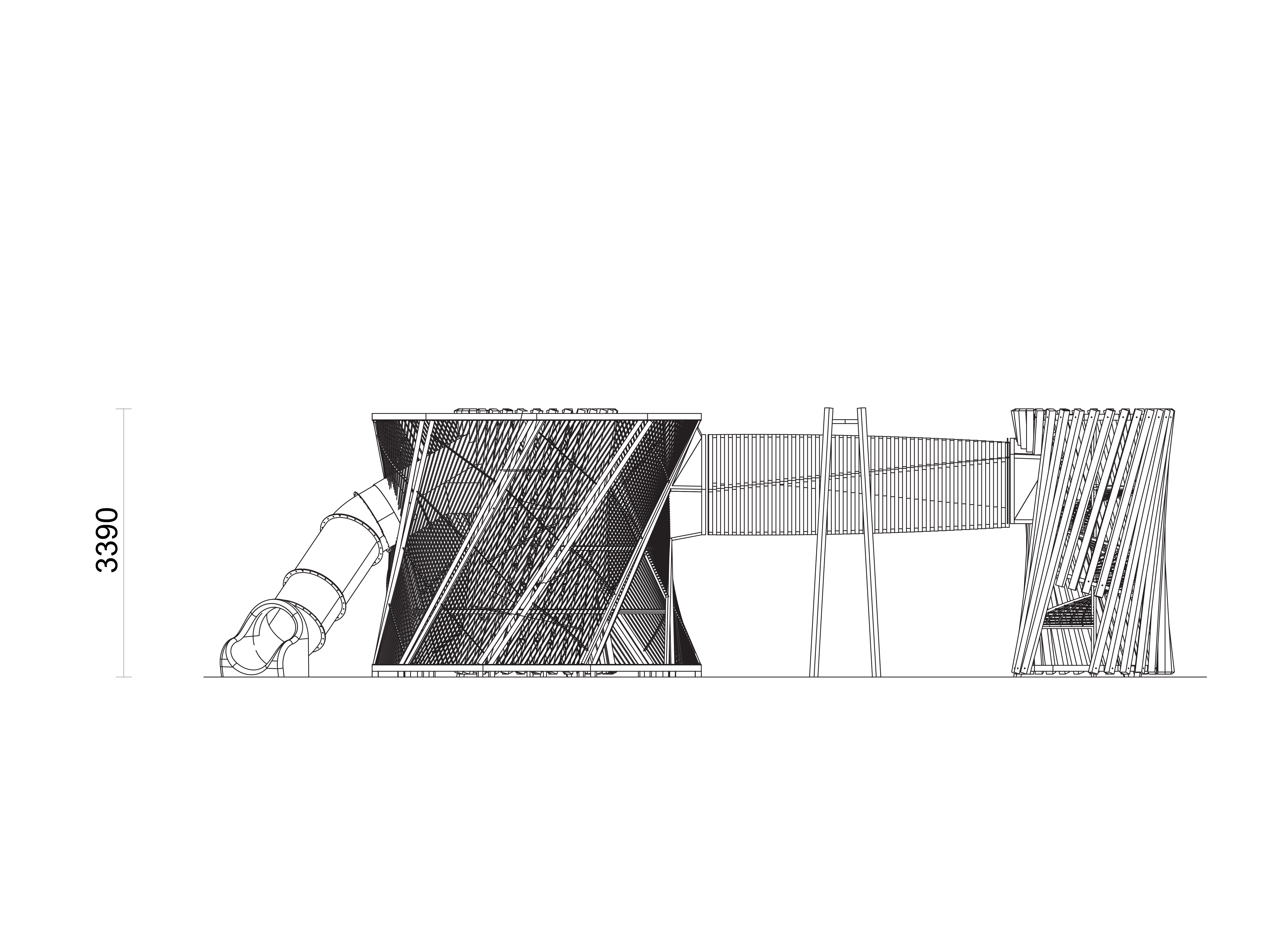At three metres in height, the towers are connected with a bridge that shares the same twisted form as the towers. Here, children can experience the height through the dazzling kaleidoscopic effect of the timber planks.