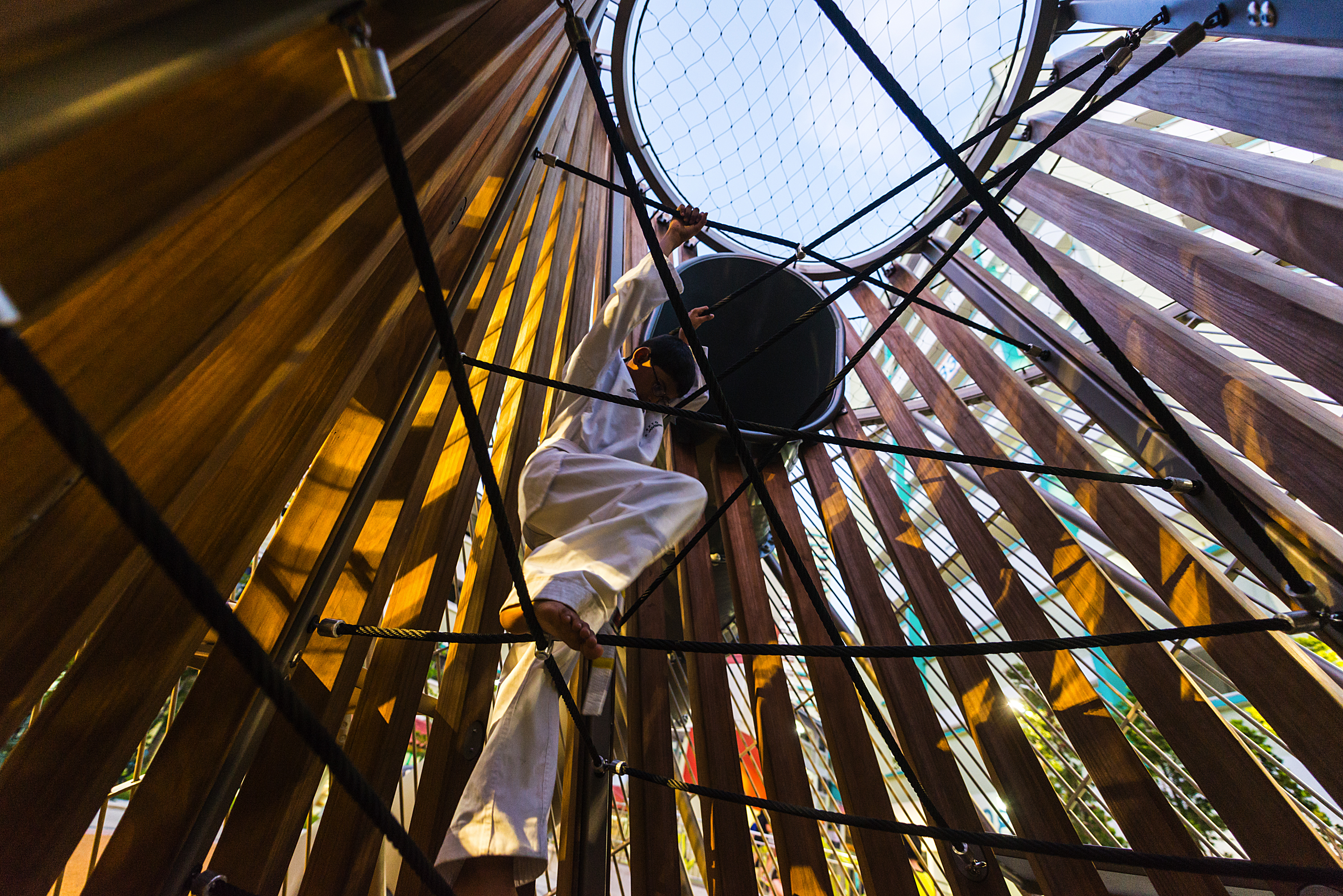 The Dune Towers are two large twisted towers, cladded with diagonal beams of timber. The facade cladding offers a sneak peek into the interior, playing on light & darkness to create a sense of mystery for the child. The interiors of the towers consist of various climbing routes with plateaus and climbing ropes that allow for different routes and difficulty levels.