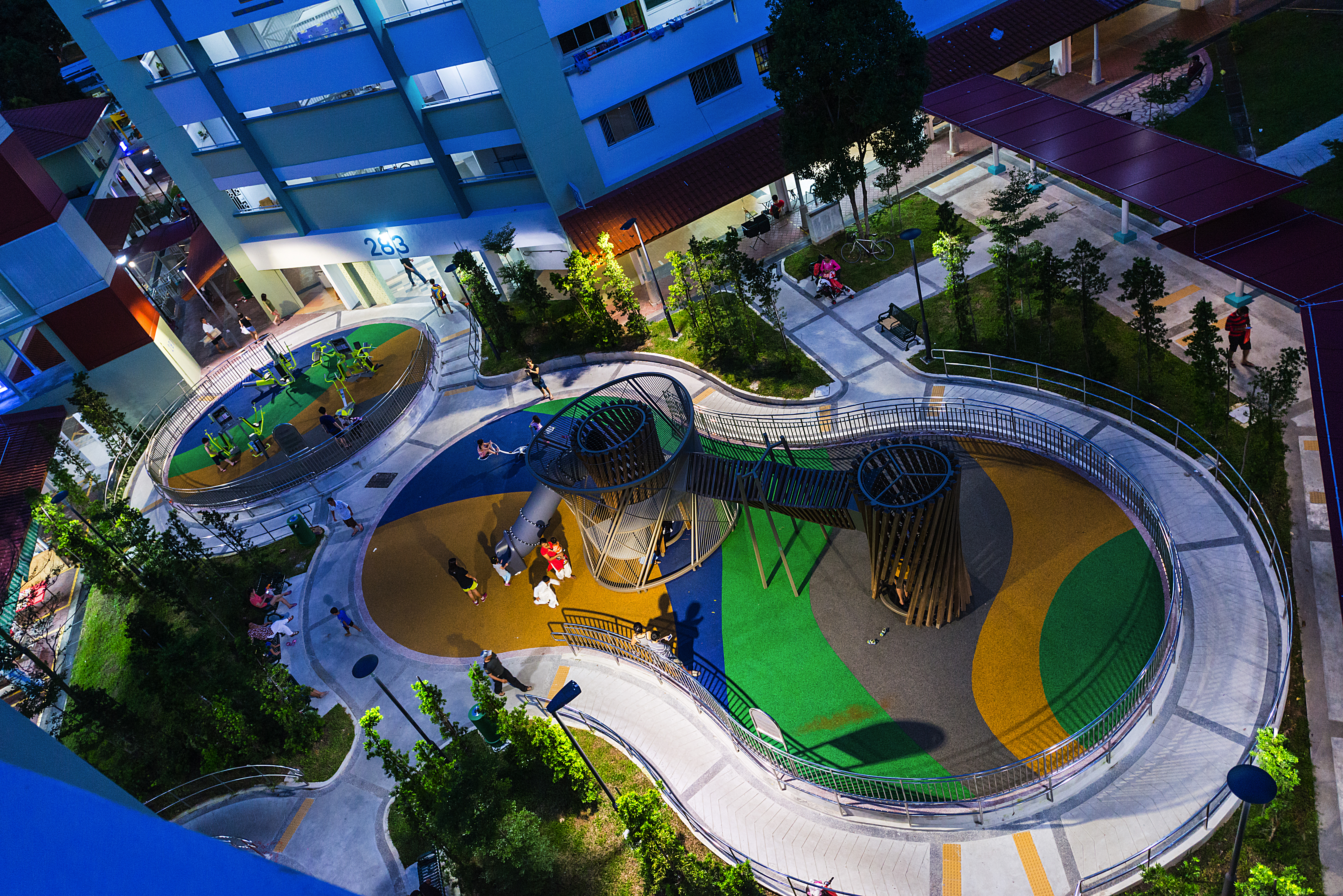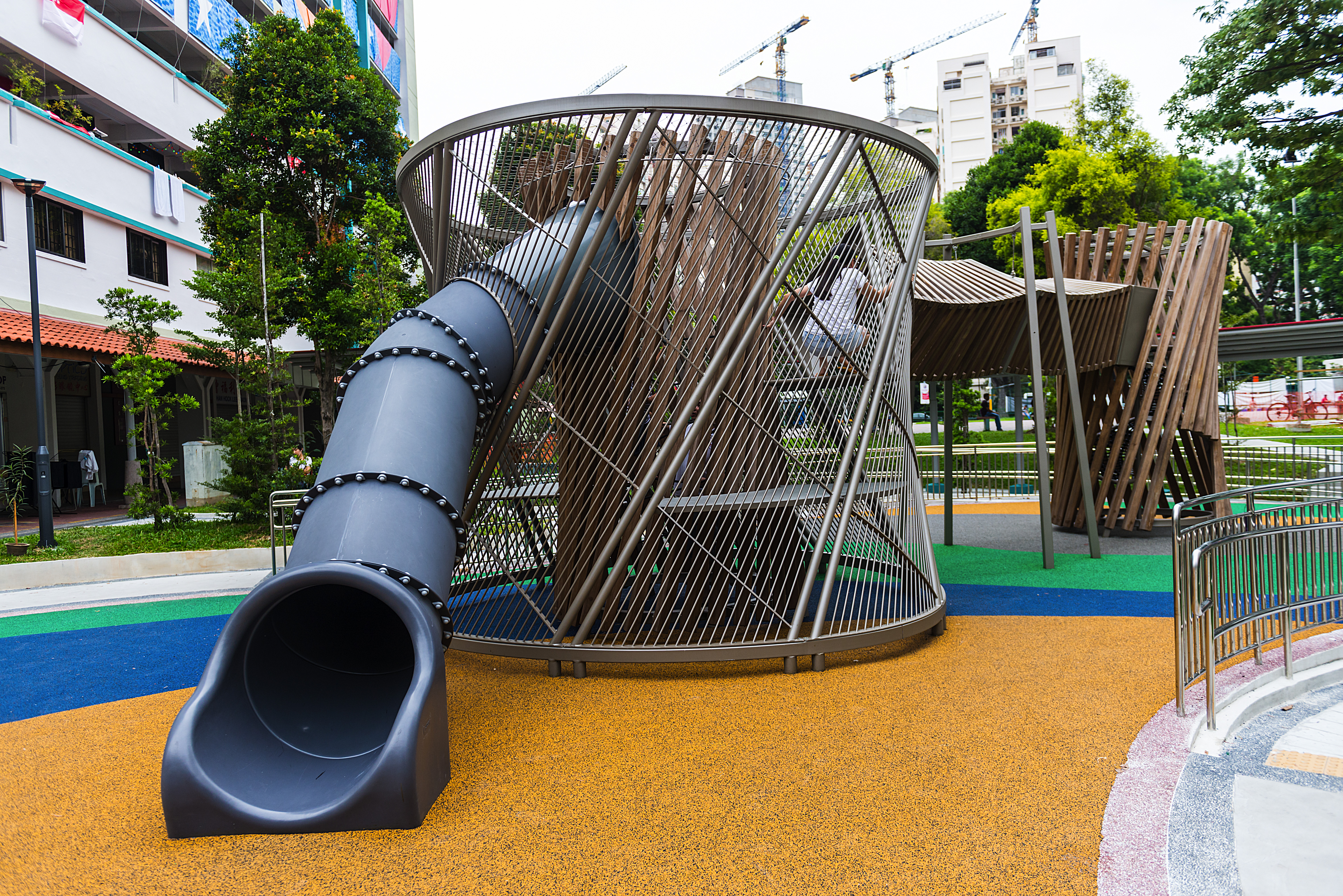 One of the towers has a ‘double skin’ that offers shade and creates a transparent effect. A large slide connects the upper level with the ground.