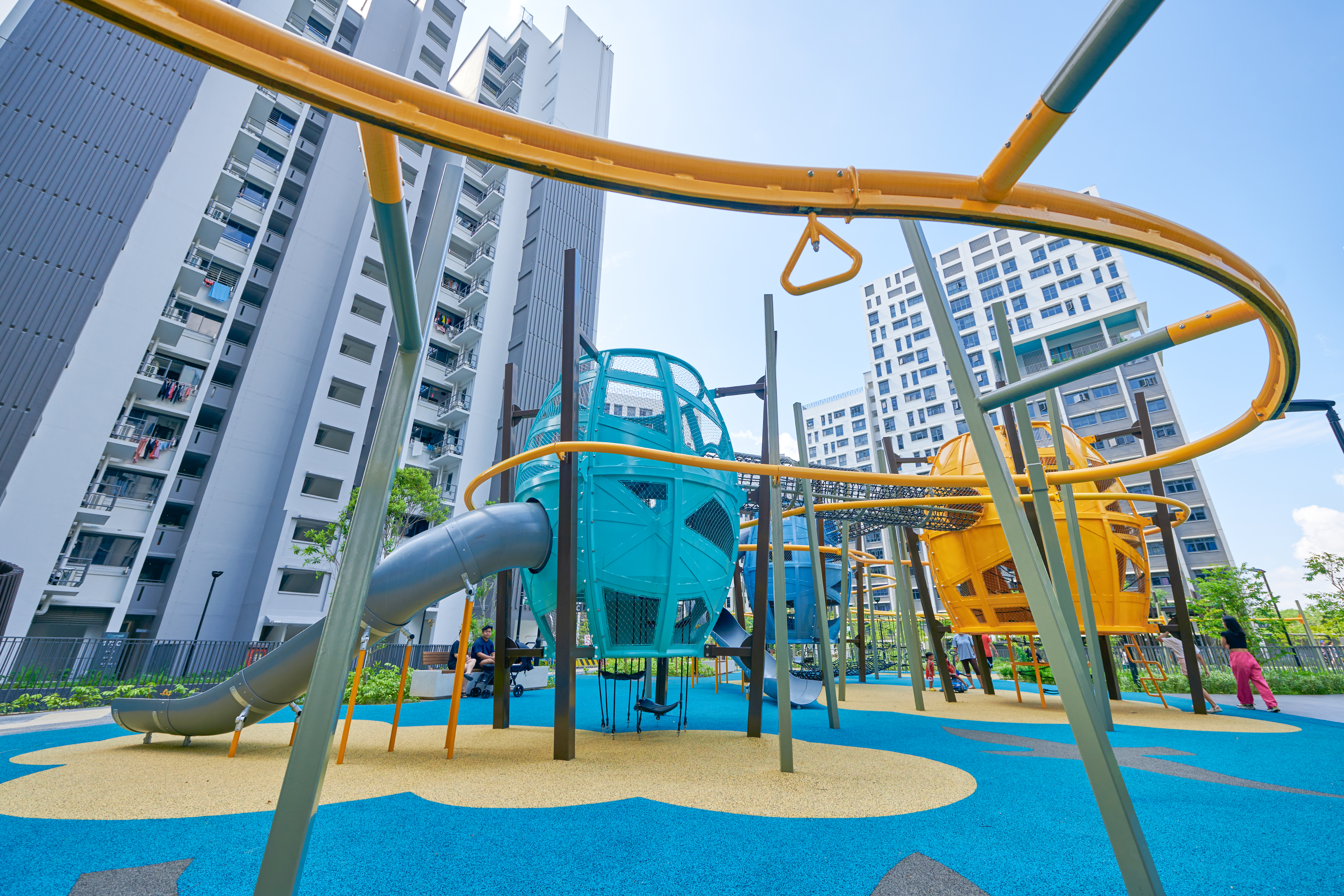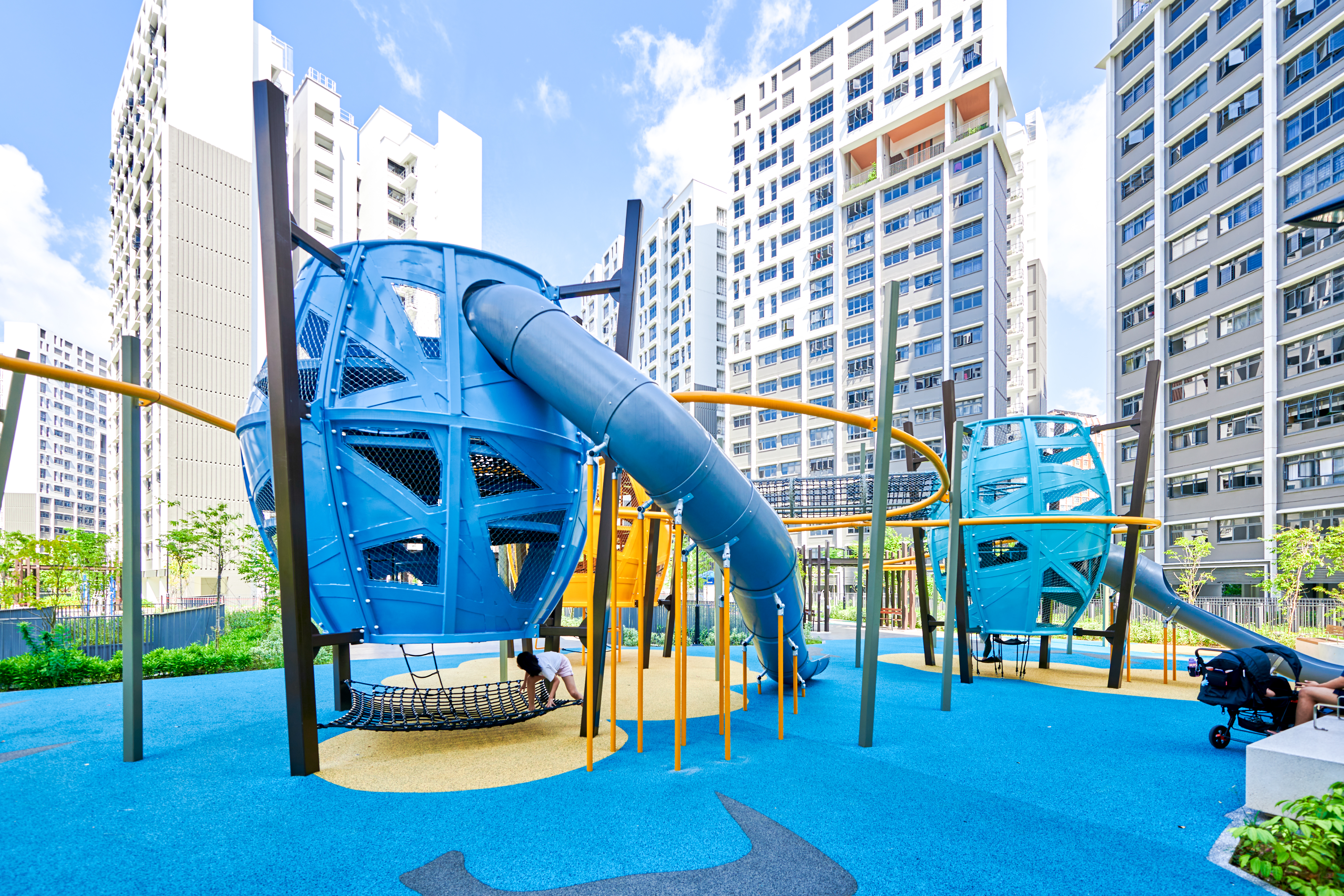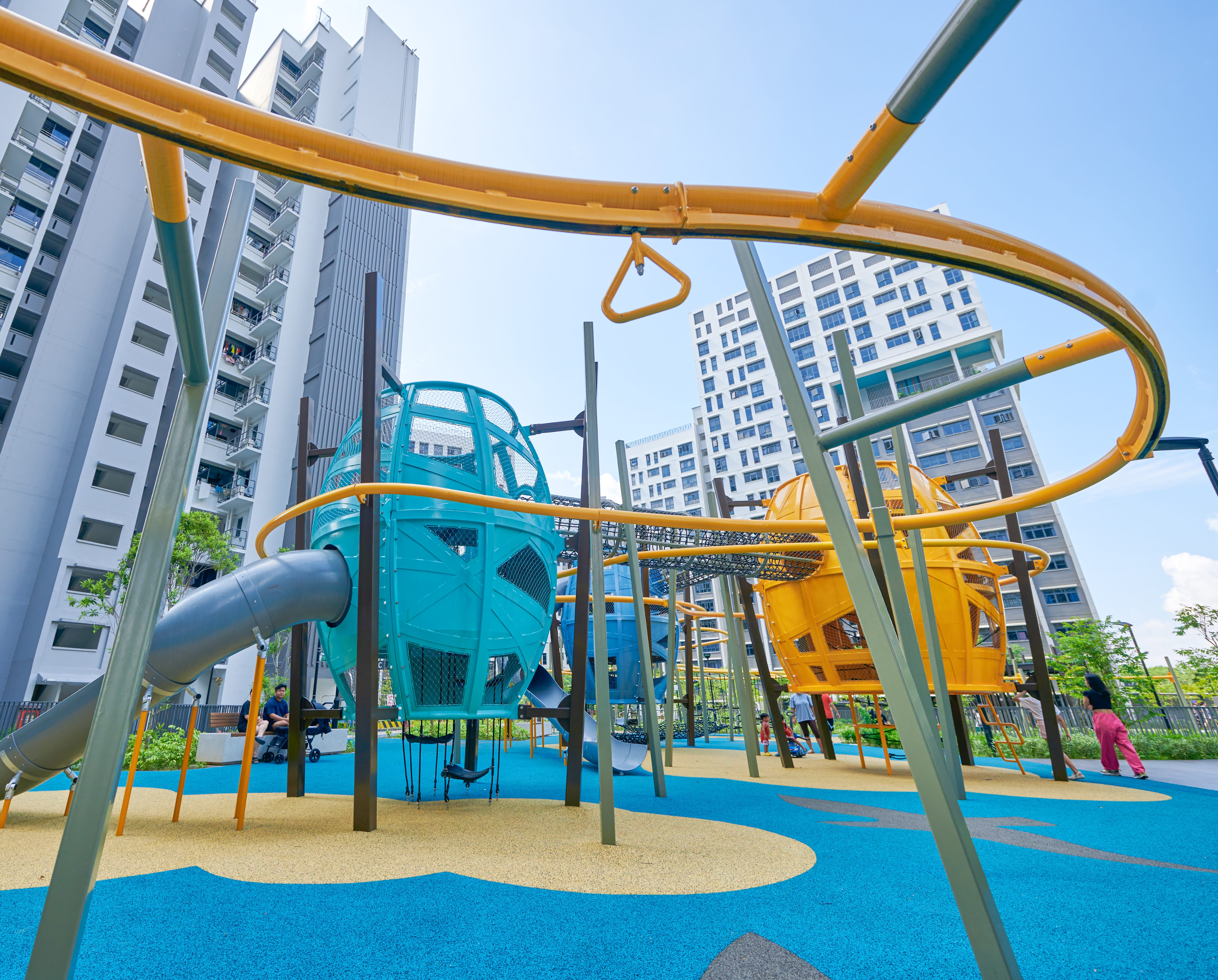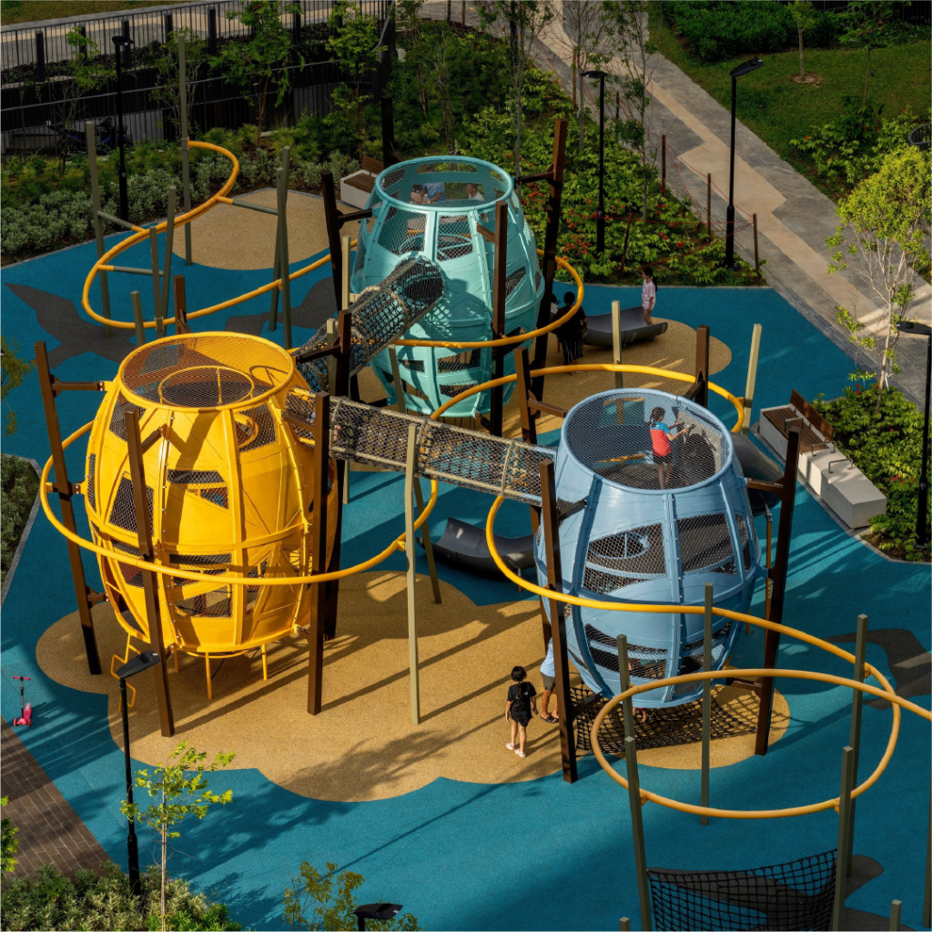 Flying Birds is centered around three large, colourful nest-like pods raised above the ground, designed to let children climb, explore and pretend to fly. These pods are connected by suspended mesh walkways and tunnels, encouraging adventurous exploration. Bright yellow rails curve around the structure, echoing the motion of wings in flight, while the winding tube slides add a sense of excitement. Every element, from the organic shapes to the airy colour palette, is thoughtfully crafted to give children the uplifting feeling of soaring through the sky.