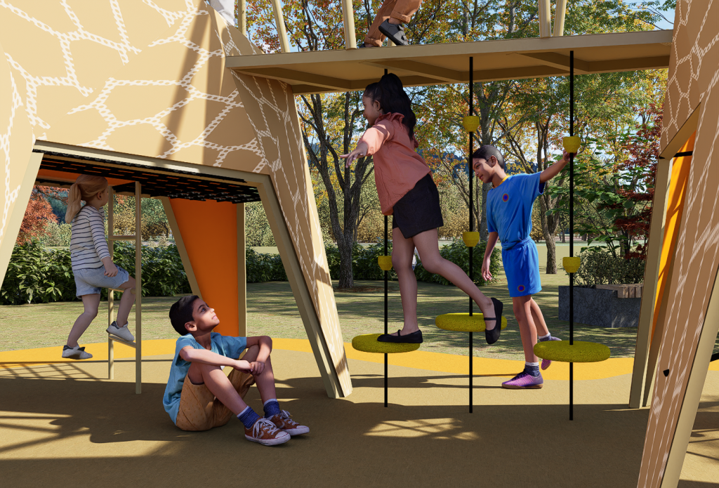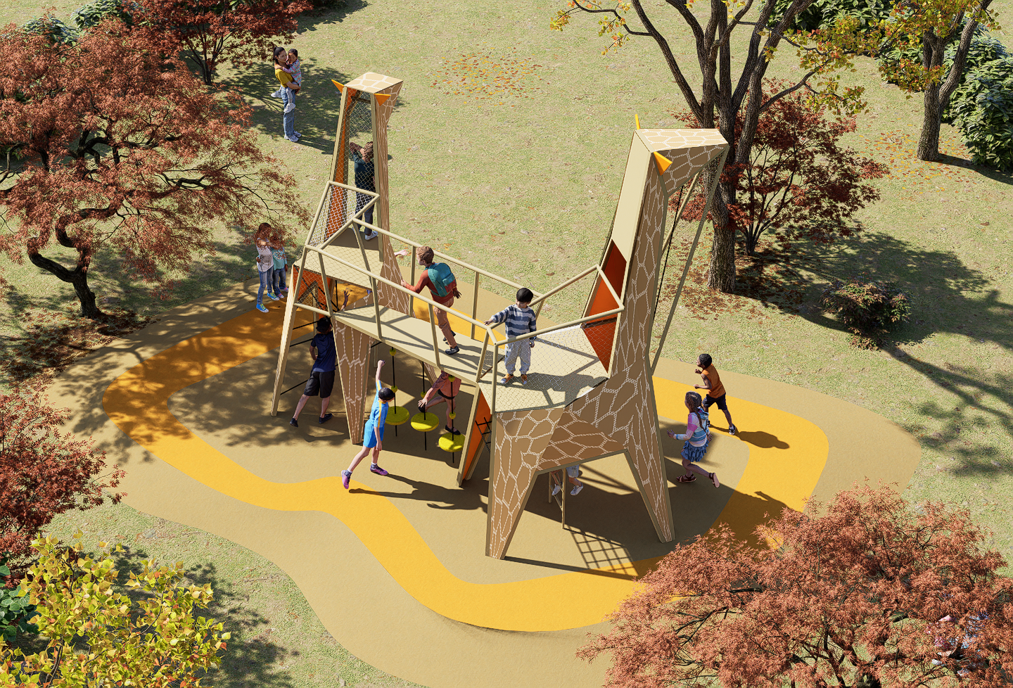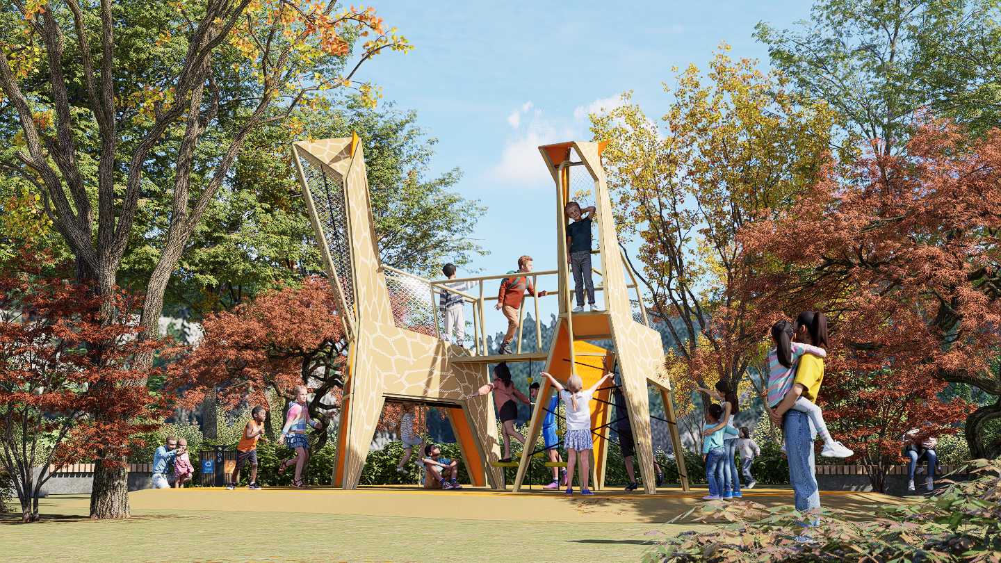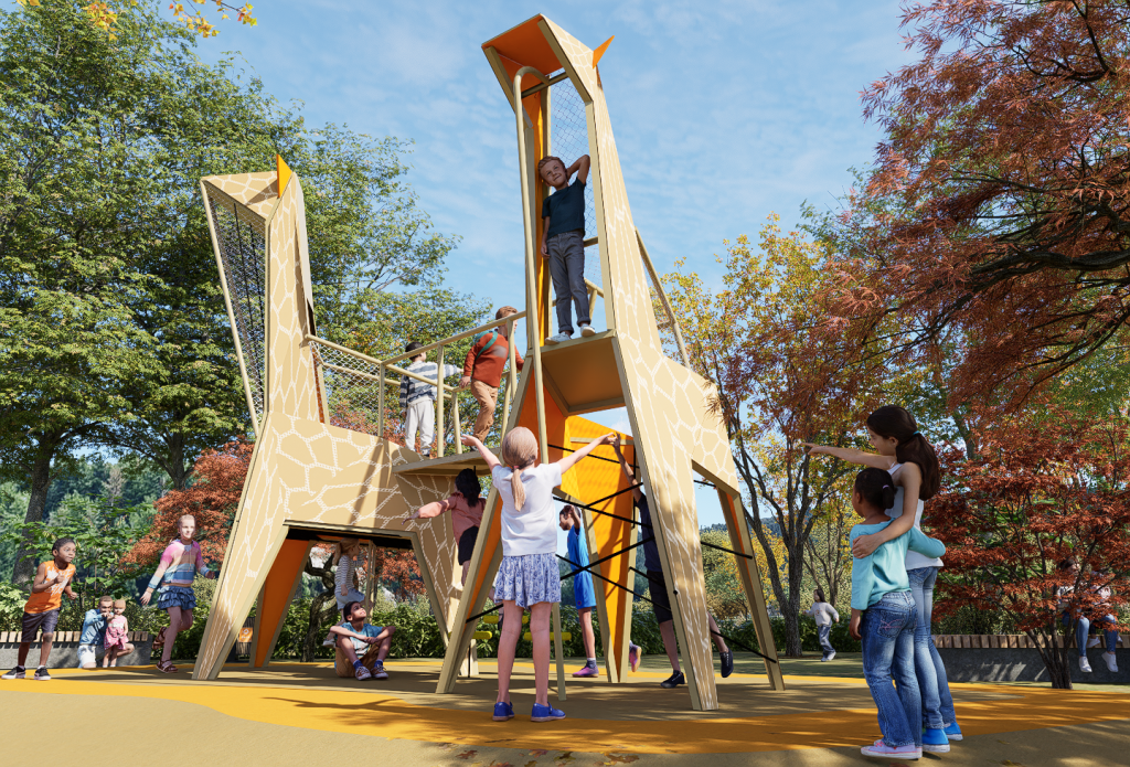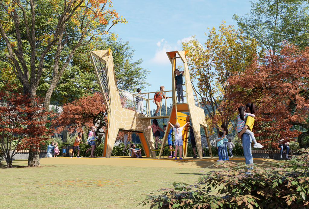Two giraffes are linked by a bridge, creating a playful landmark. Children climb through the giraffe’s legs up to its head, where they can slide down a fireman’s pole or return by climbing. The design emphasizes strength, balance, and endurance through vertical play.