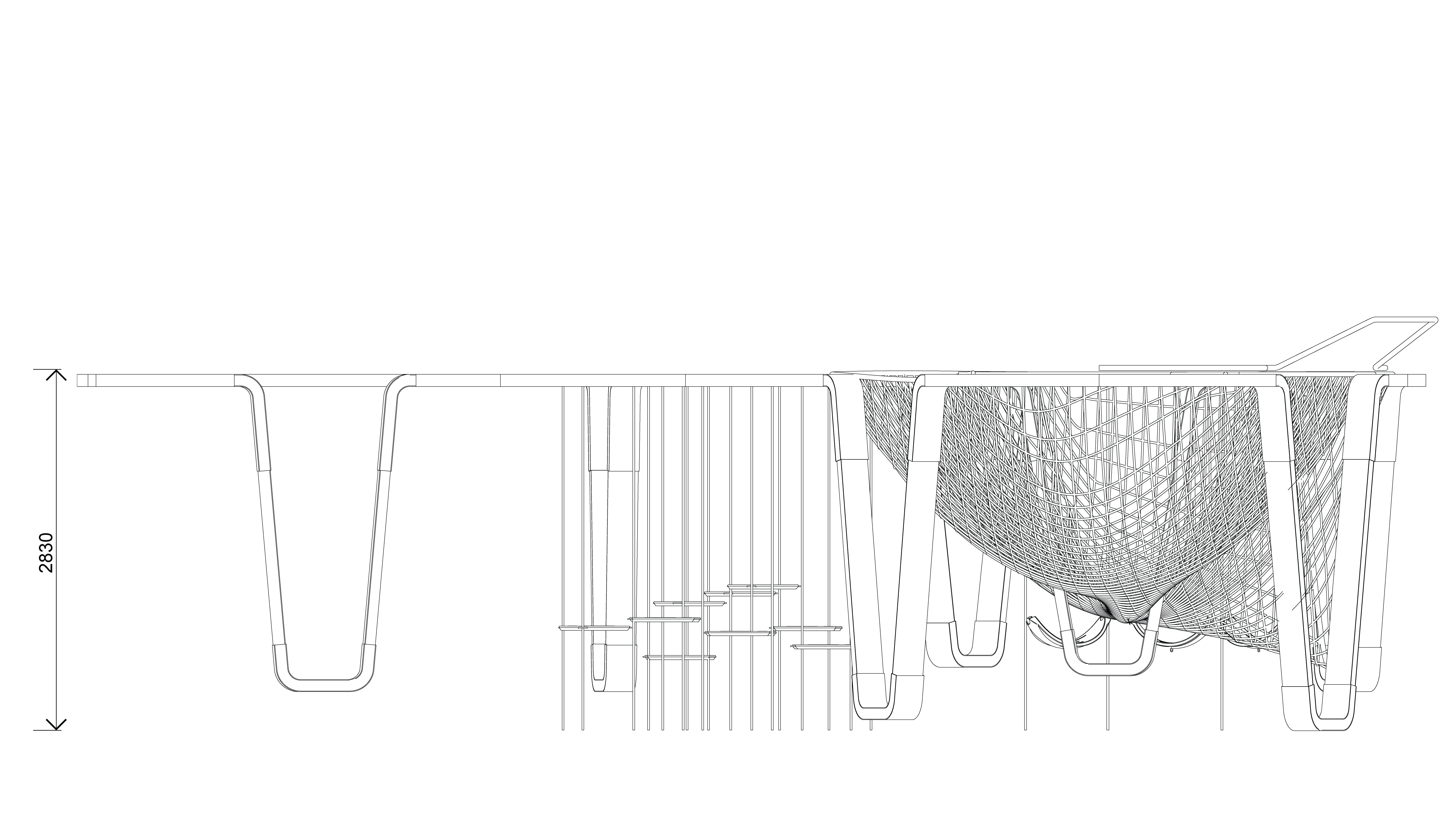 Angular frames form a striking architectural outline, while suspended nets create playful “nest-like” zones. The open design allows free flow between climbing, lounging, and balancing, transforming the geometry into an inviting space for exploration.