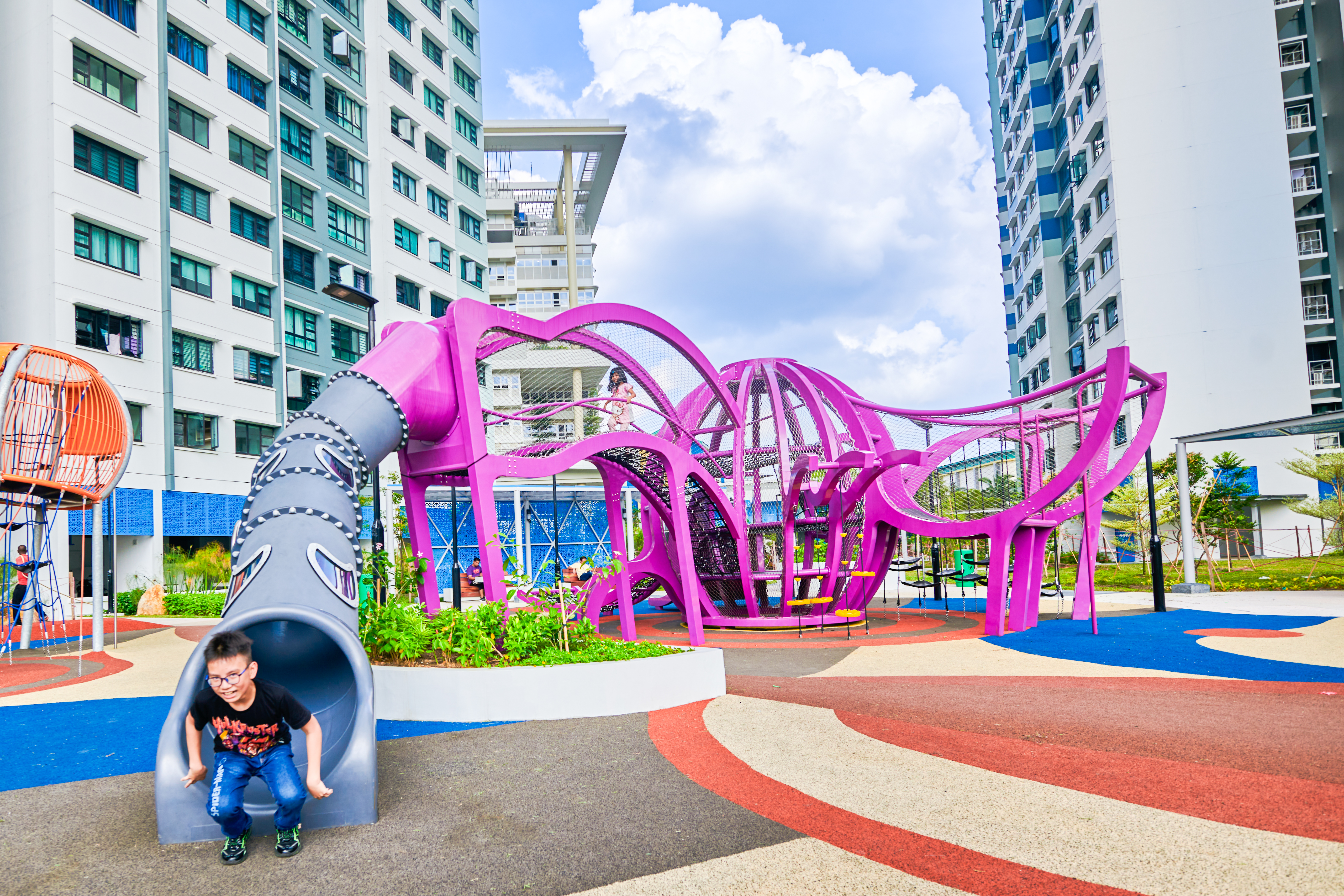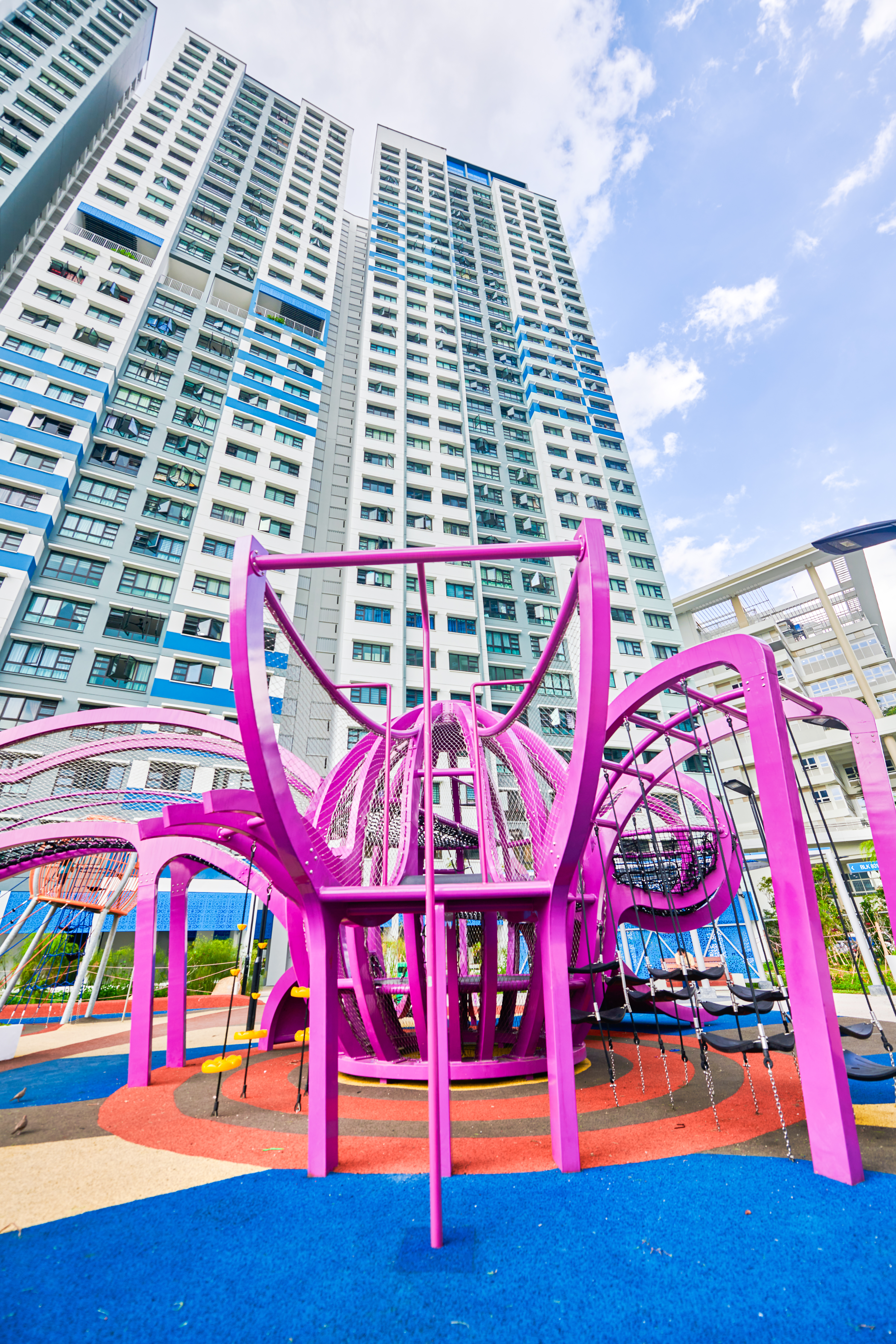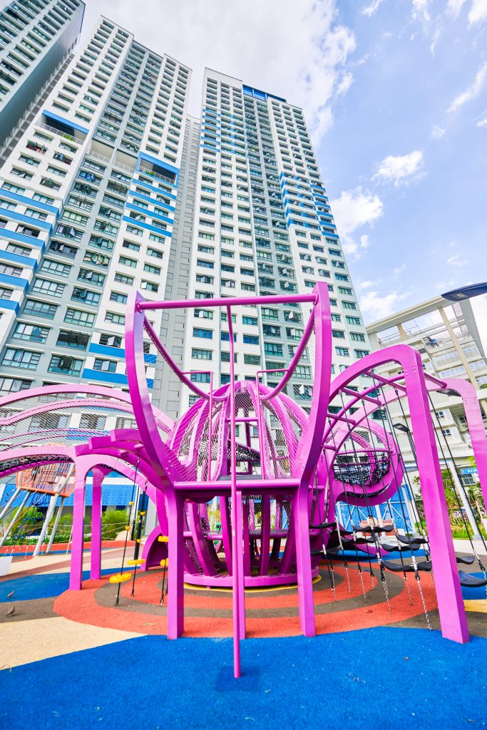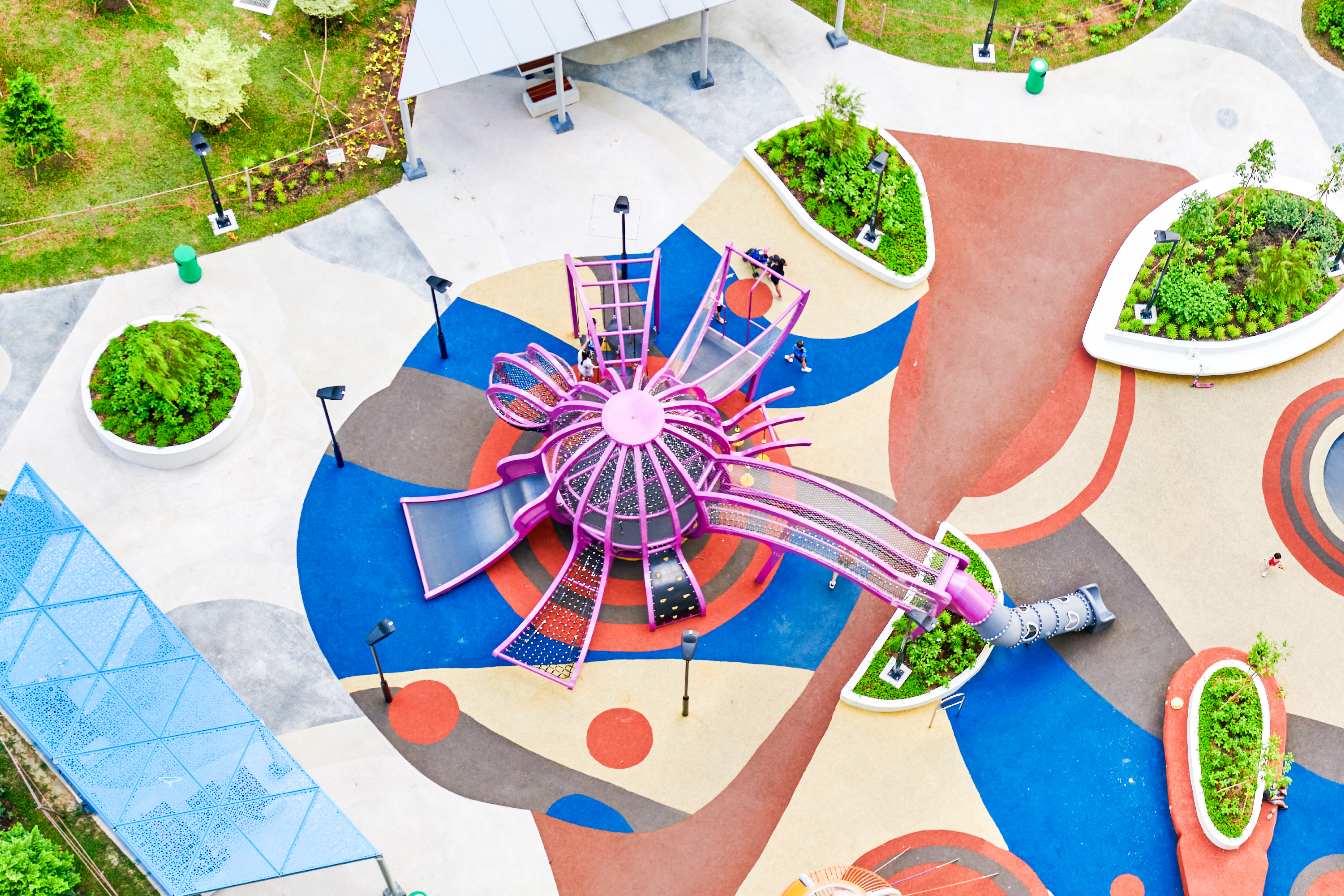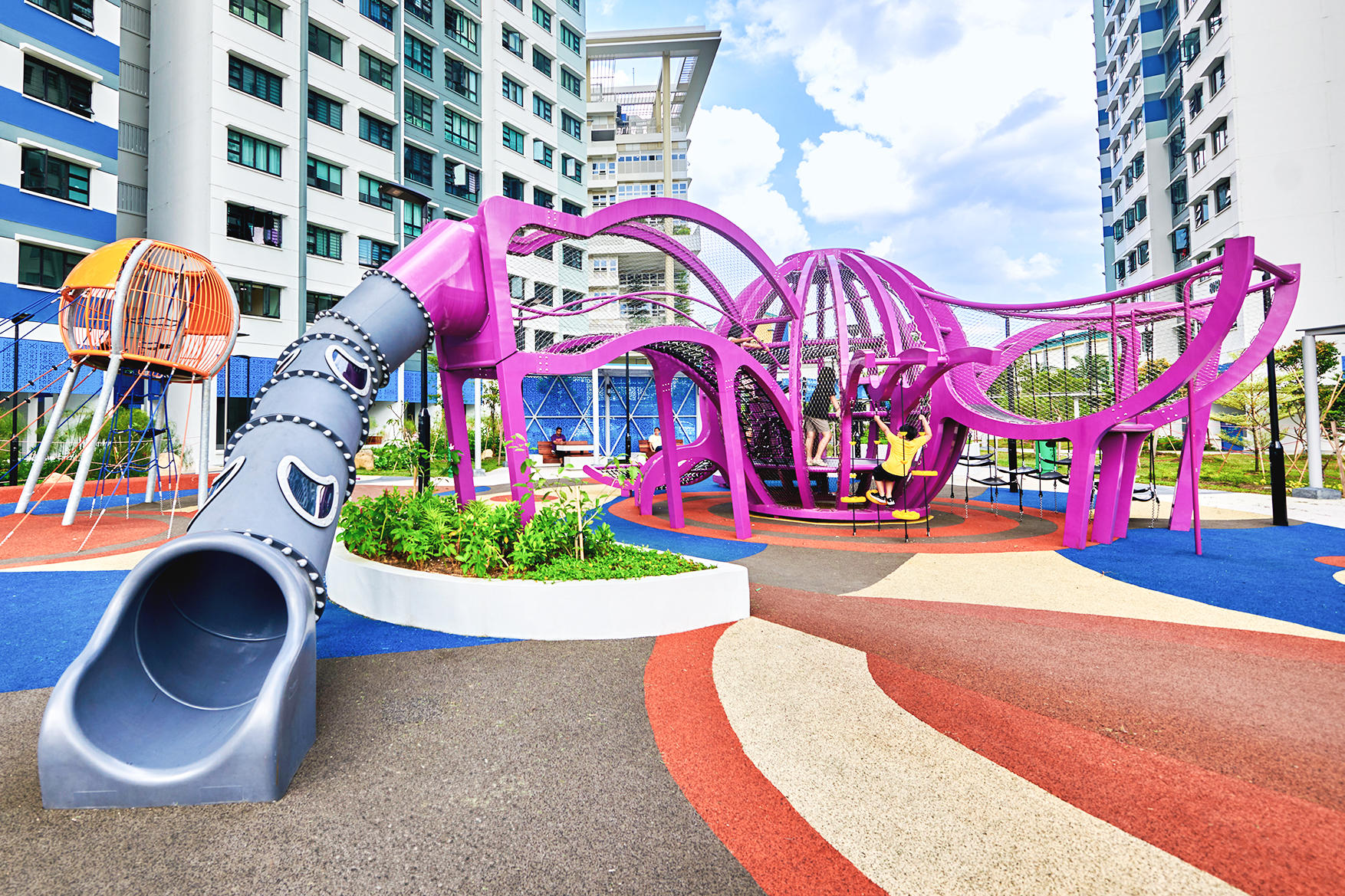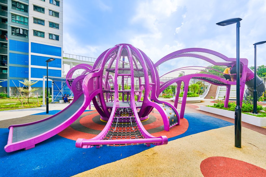 The structure is composed of dynamic, tentacle-like arms branching out in multiple directions, each hosting a different play element. Children can climb, slide, balance, and swing, choosing their own path through the play sculpture. The design emphasizes movement and discovery, while the vibrant finishes ensure the playground stands out as both an architectural feature and a hub for social play.