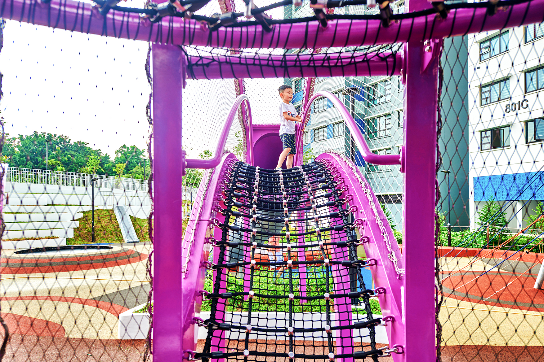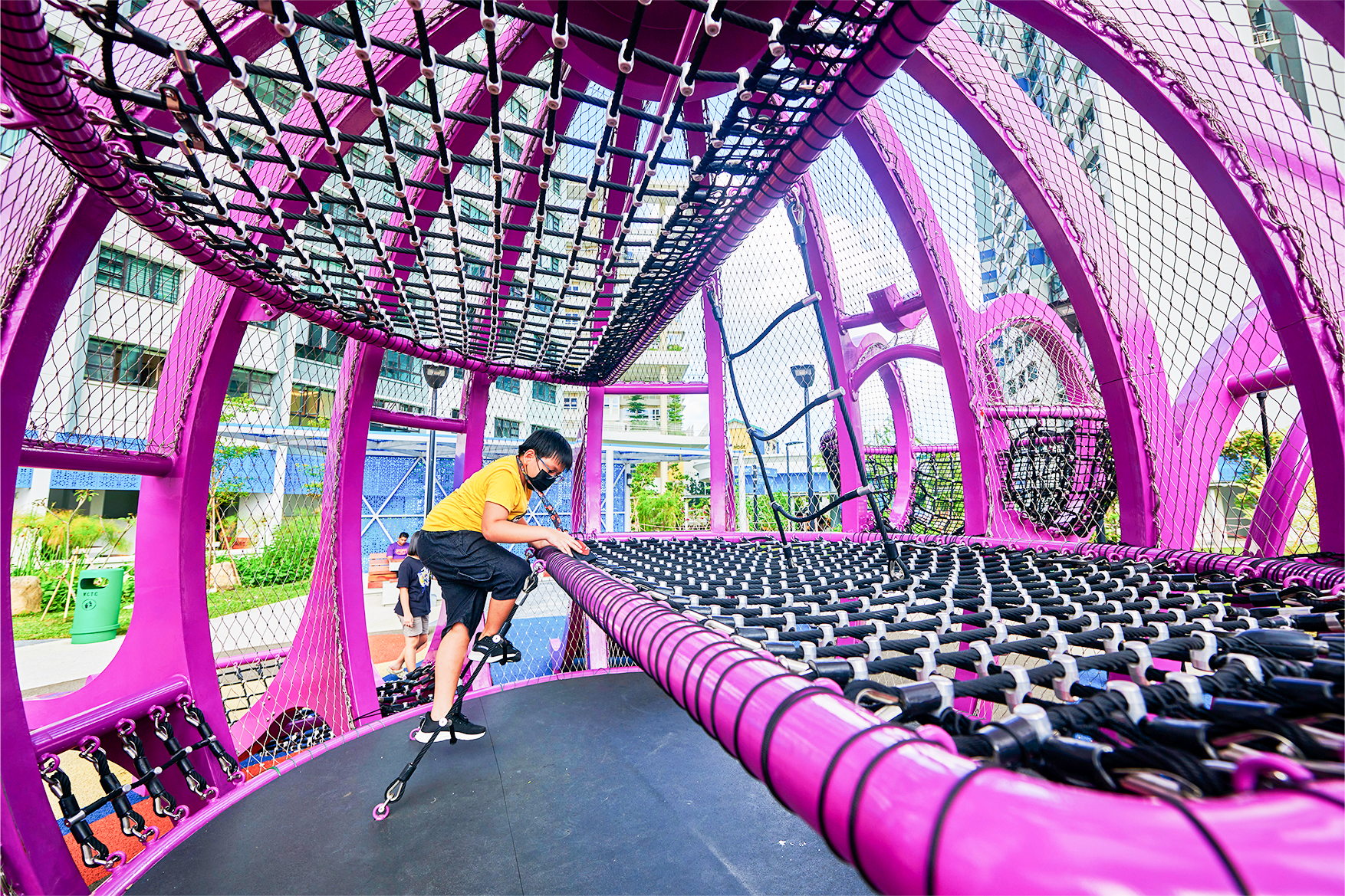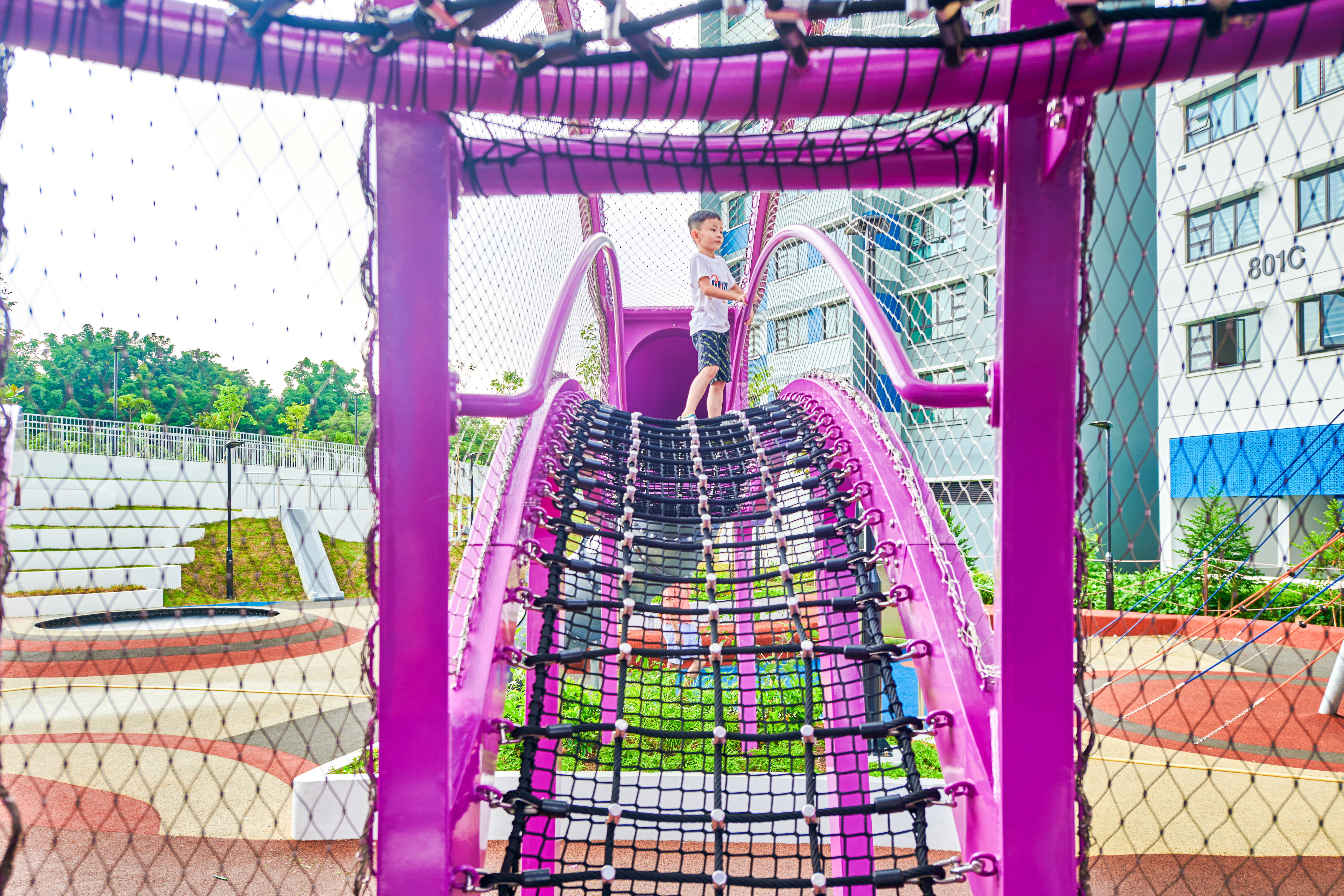 A rubber membrane slope that works as both a gentle climber and a smooth slide, offering versatile play in one feature.