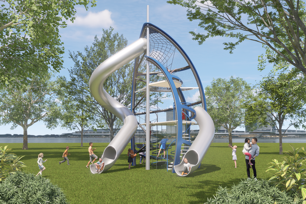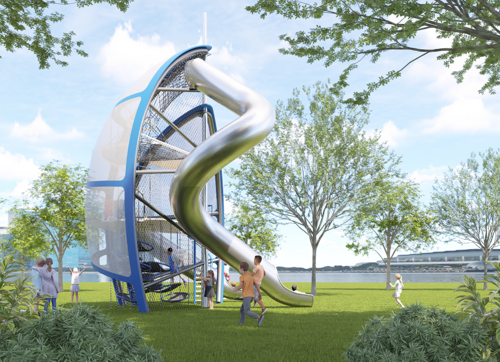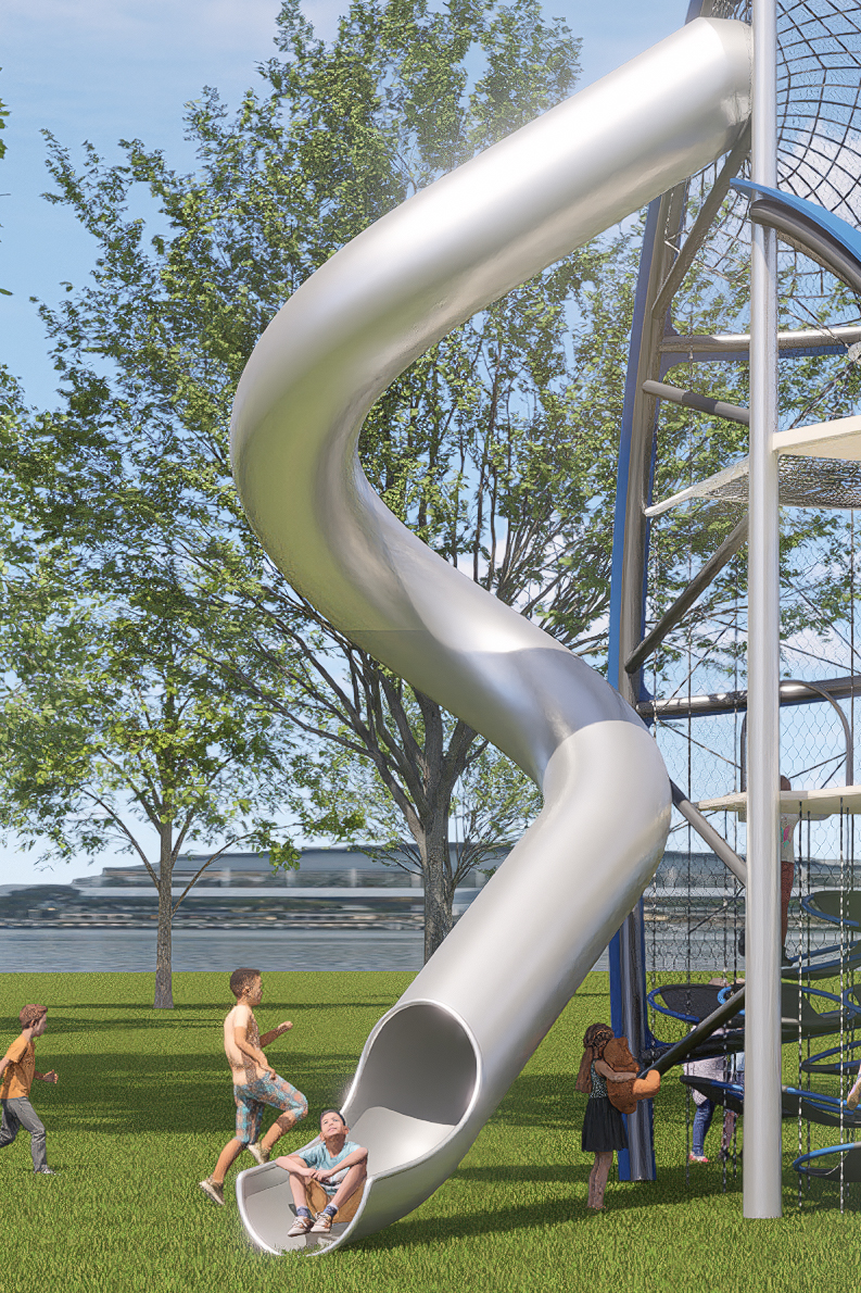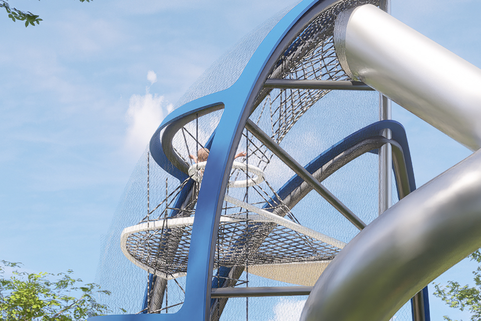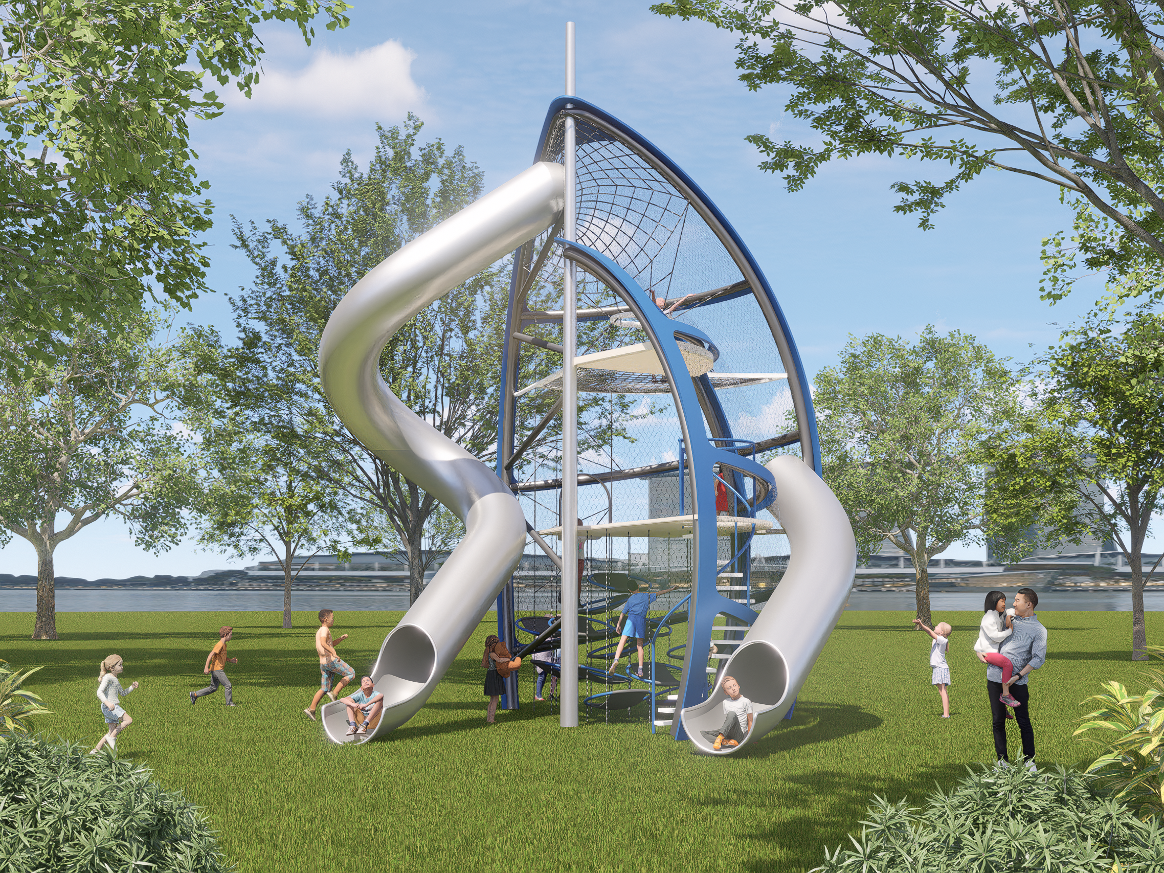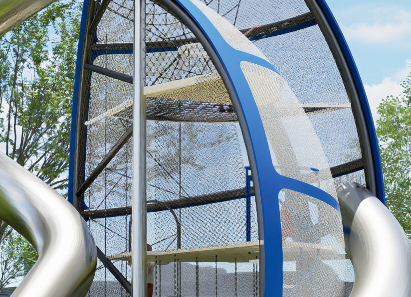 The Sail is shaped to emulate the vertical lift of a sailboat’s mast and sail, creating a sculptural centerpiece for active play. Climbing nets, angled panels, and vertical ascents simulate the challenge of rigging and ropes, promoting upper-body strength and coordination. Platforms at varying heights offer lookout points, much like a sailor’s perch, before children launch into the thrill of its two slides. With its elegant silhouette and purposeful play features, The Sail merges architectural beauty with functional fun, making it both a visual icon and an engaging adventure zone.