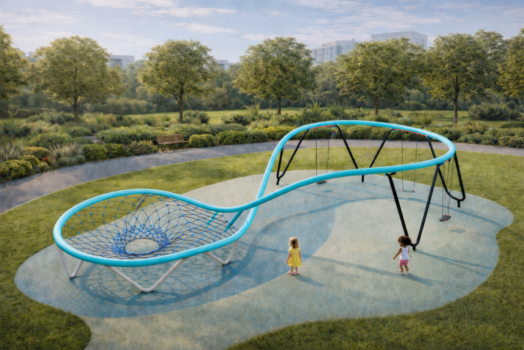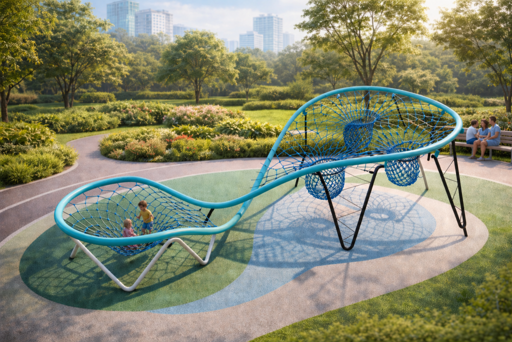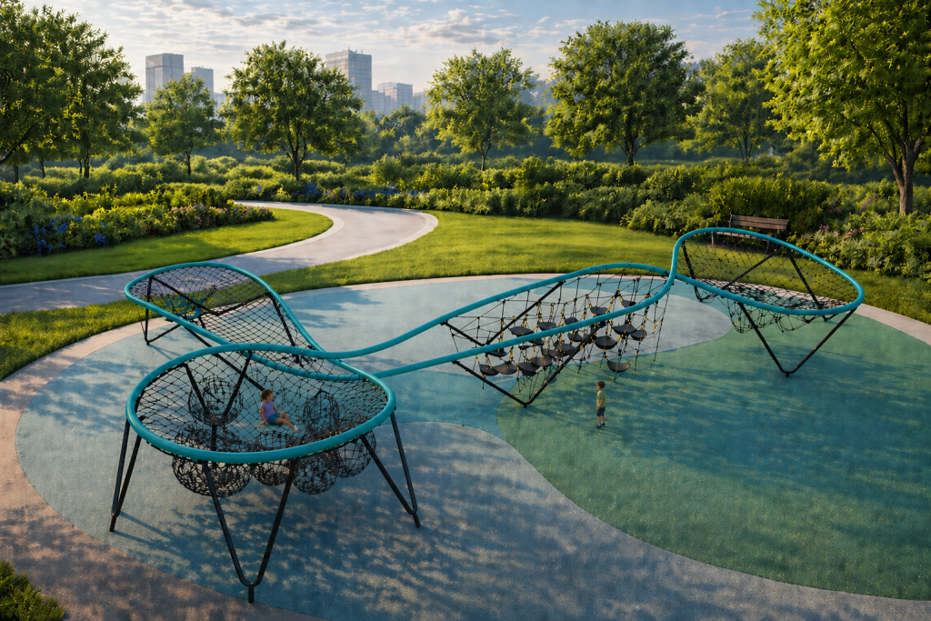 The design of Whoosh Double Loop features elegant, wave-like tubing and dynamic netting that creates a three-dimensional sculptural form. The suspended ropes, balance bridges, and lounging nets are positioned to challenge movement in every direction—making the play experience less linear and more immersive. It’s not only a climbing structure, but a landscape to crawl over, hang under, and relax within.
