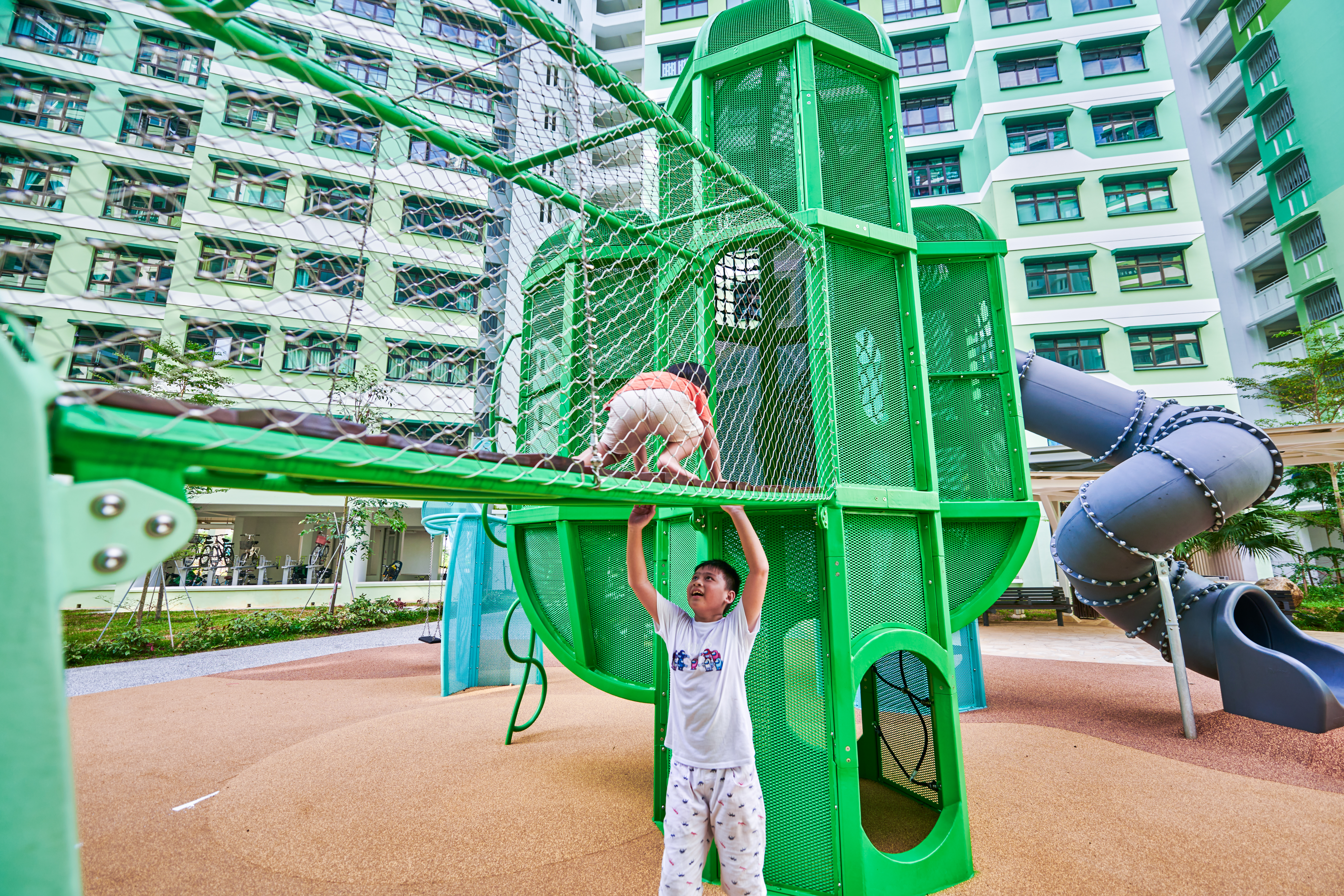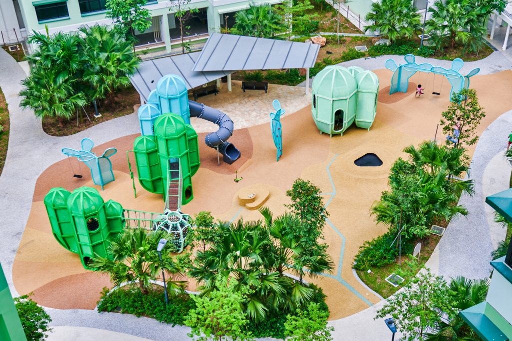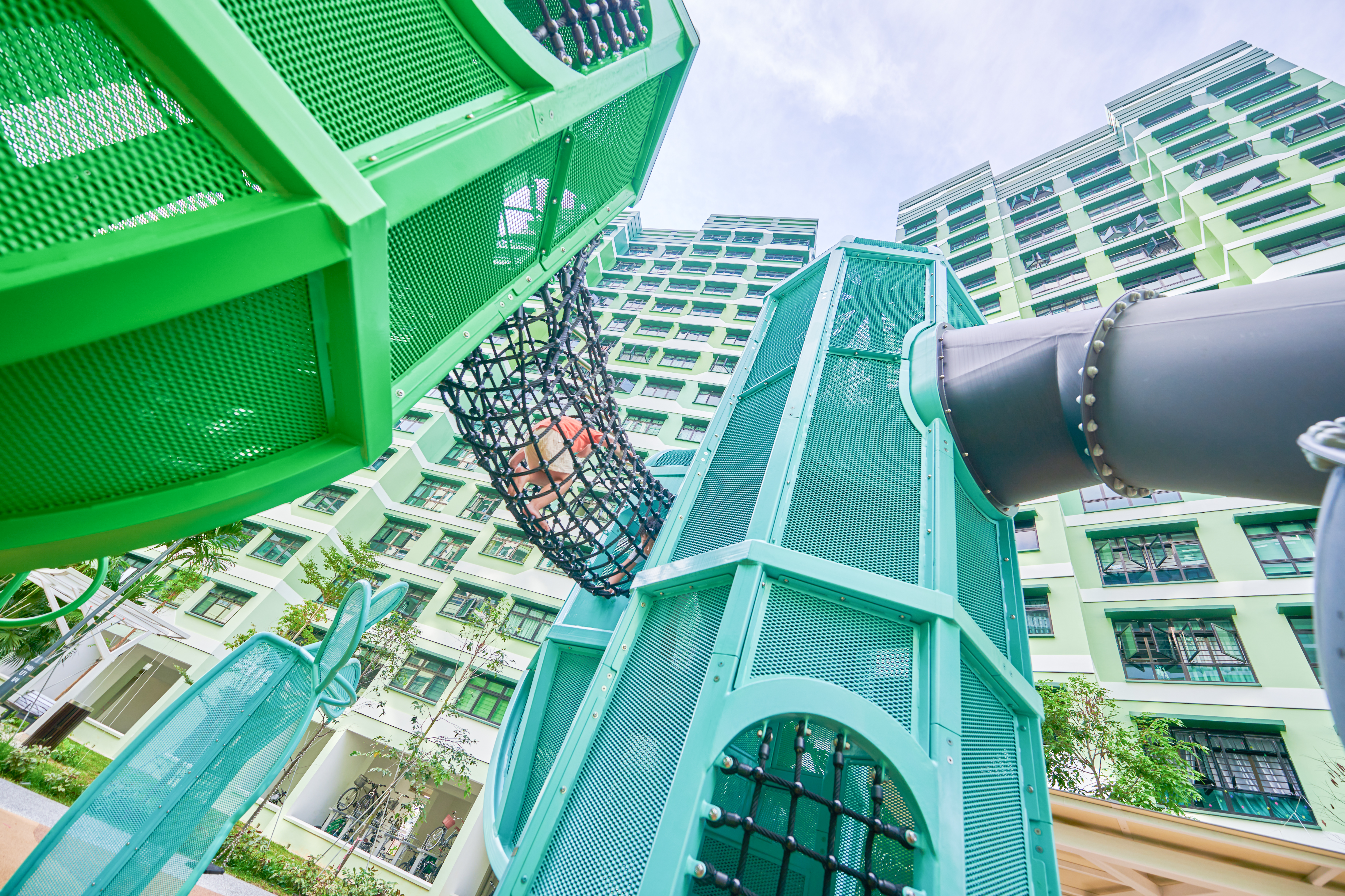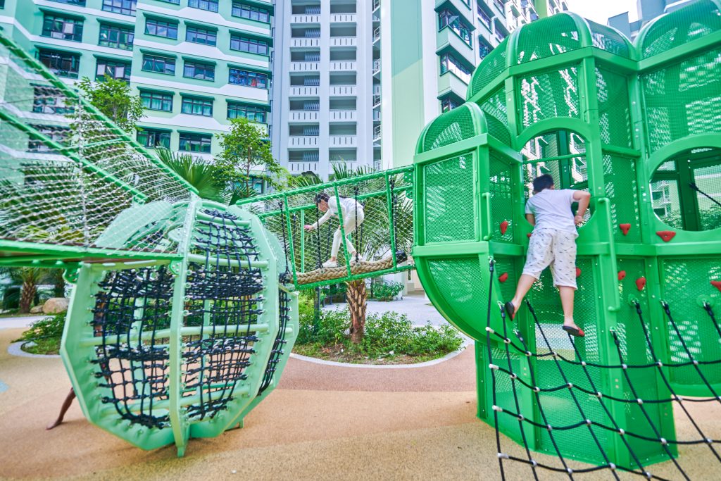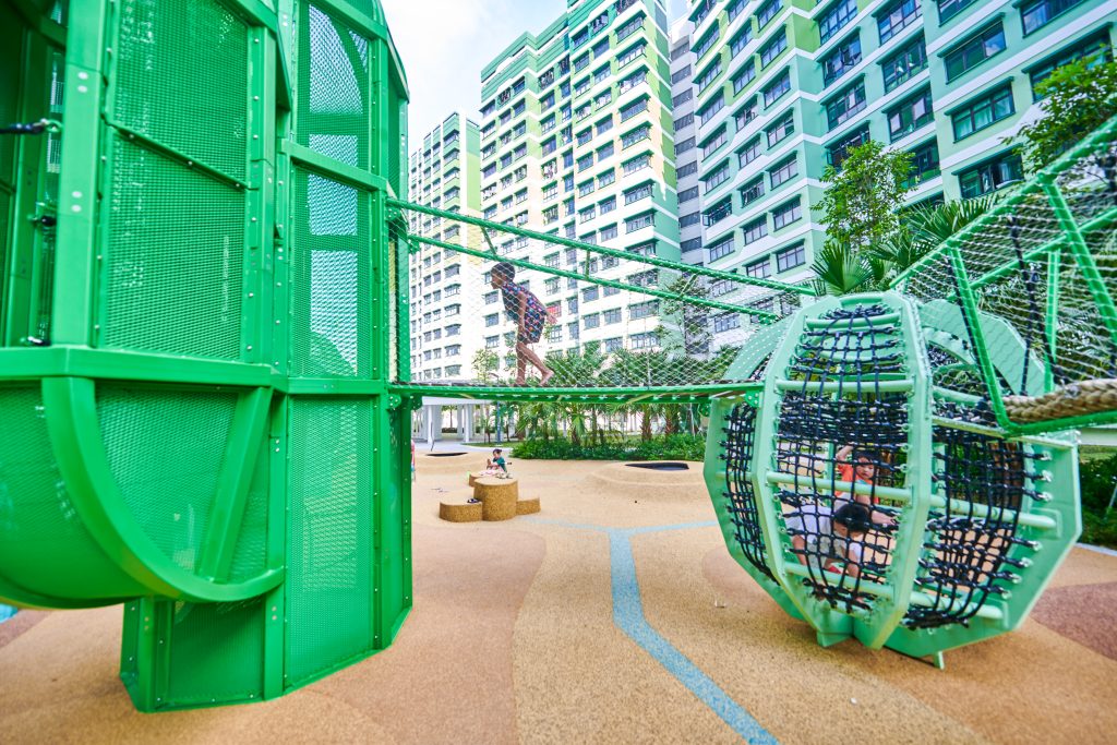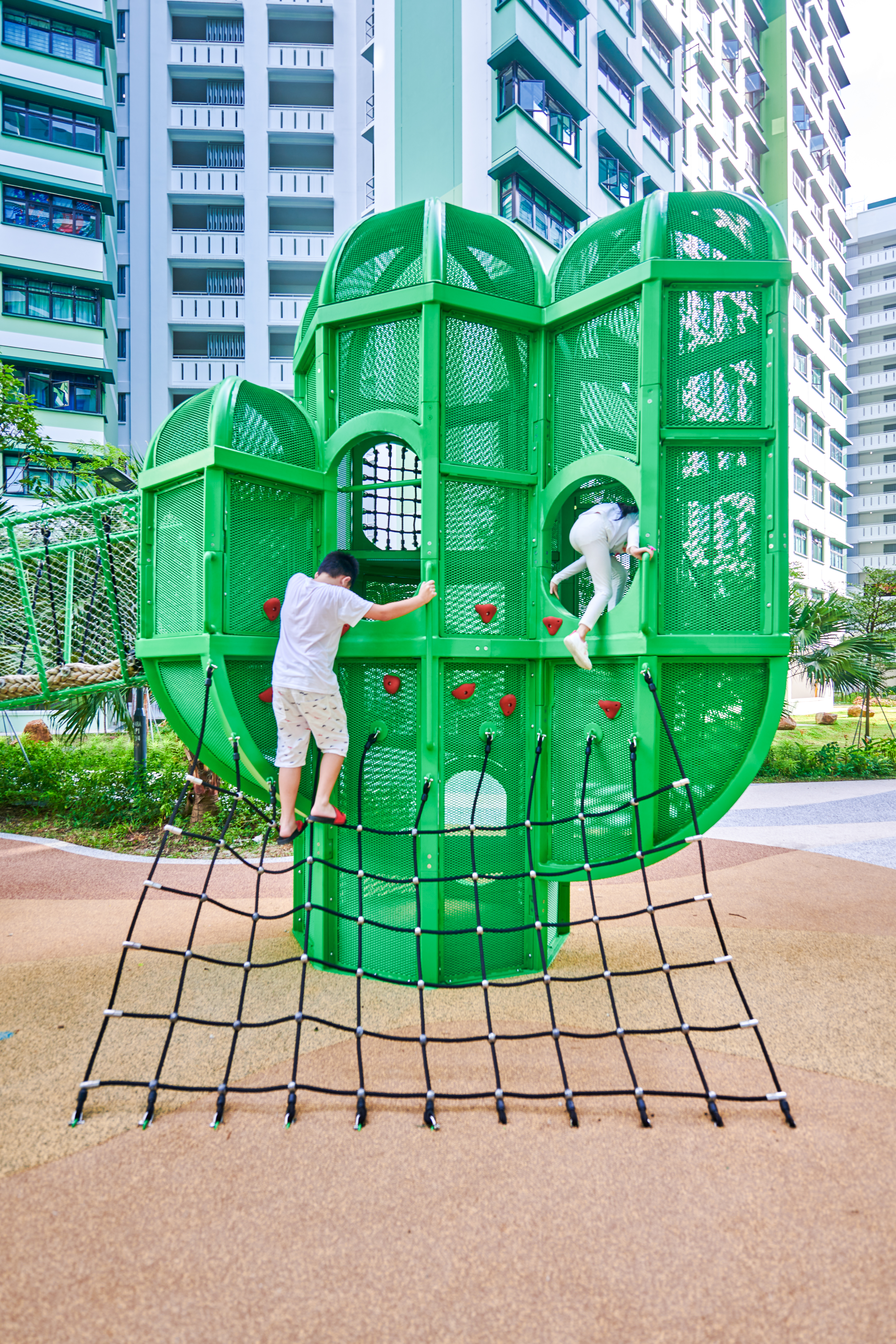 A unique cacti structures feature a slide for thrilling descents, a crawling bridge for exciting challenges, a net sphere for exploration, and a climbing net for reaching new heights.