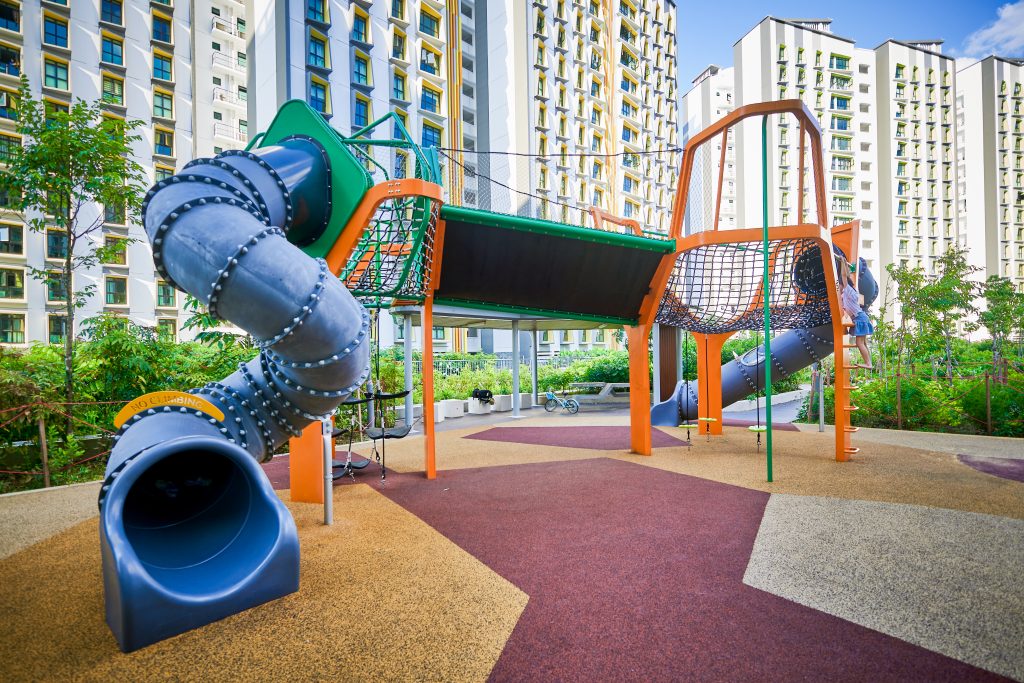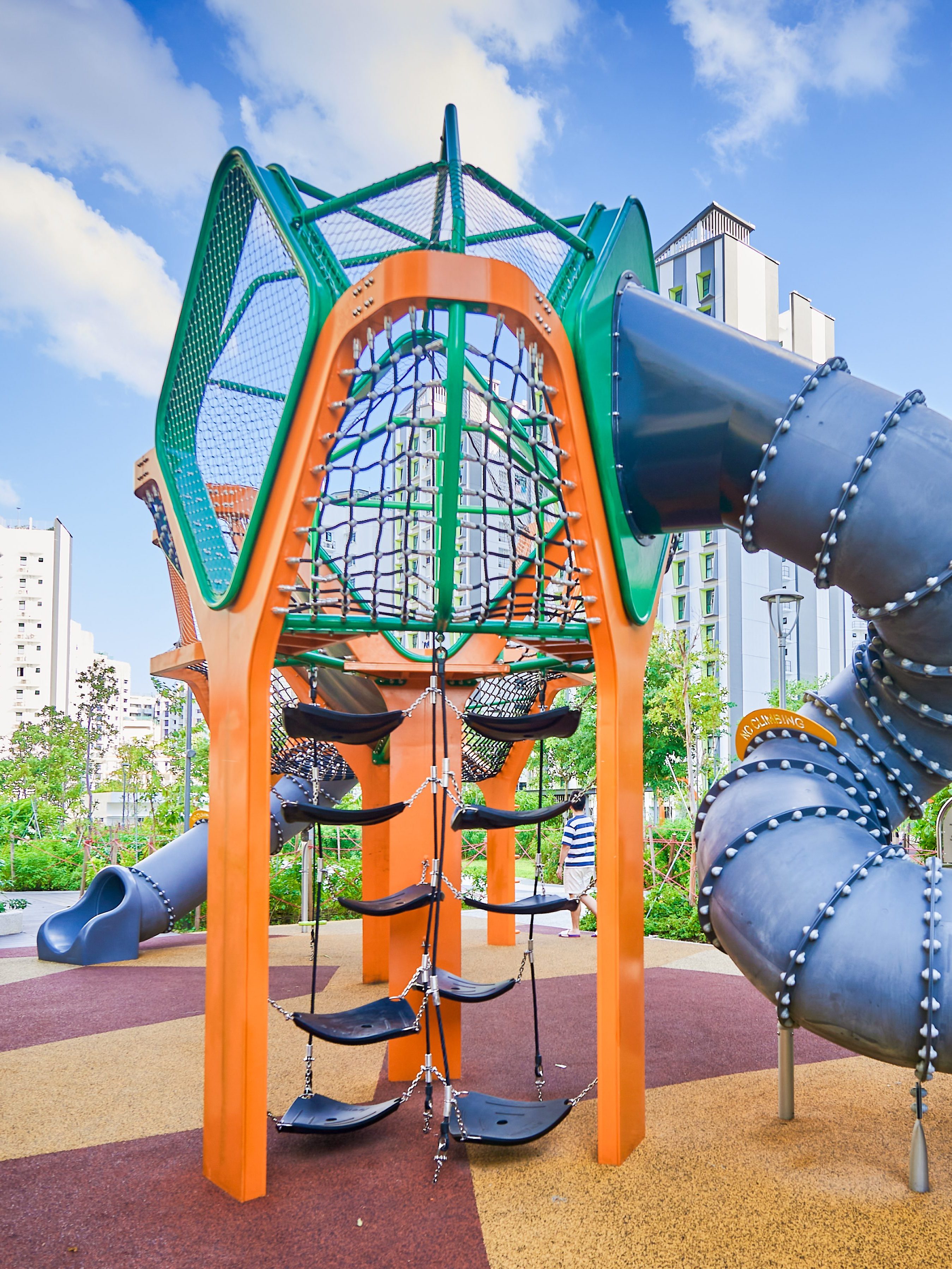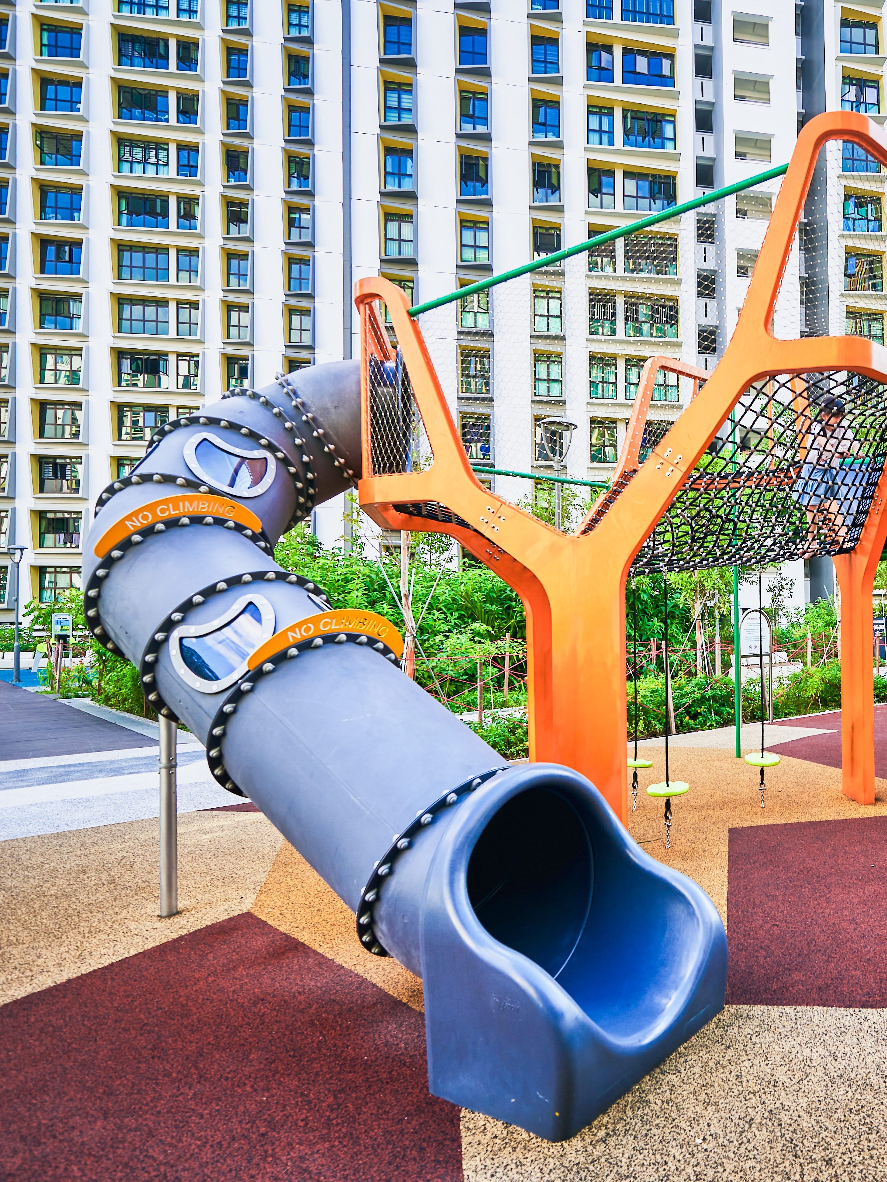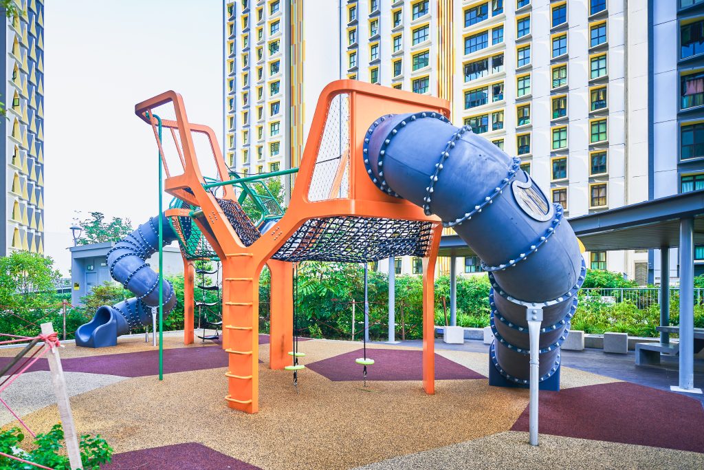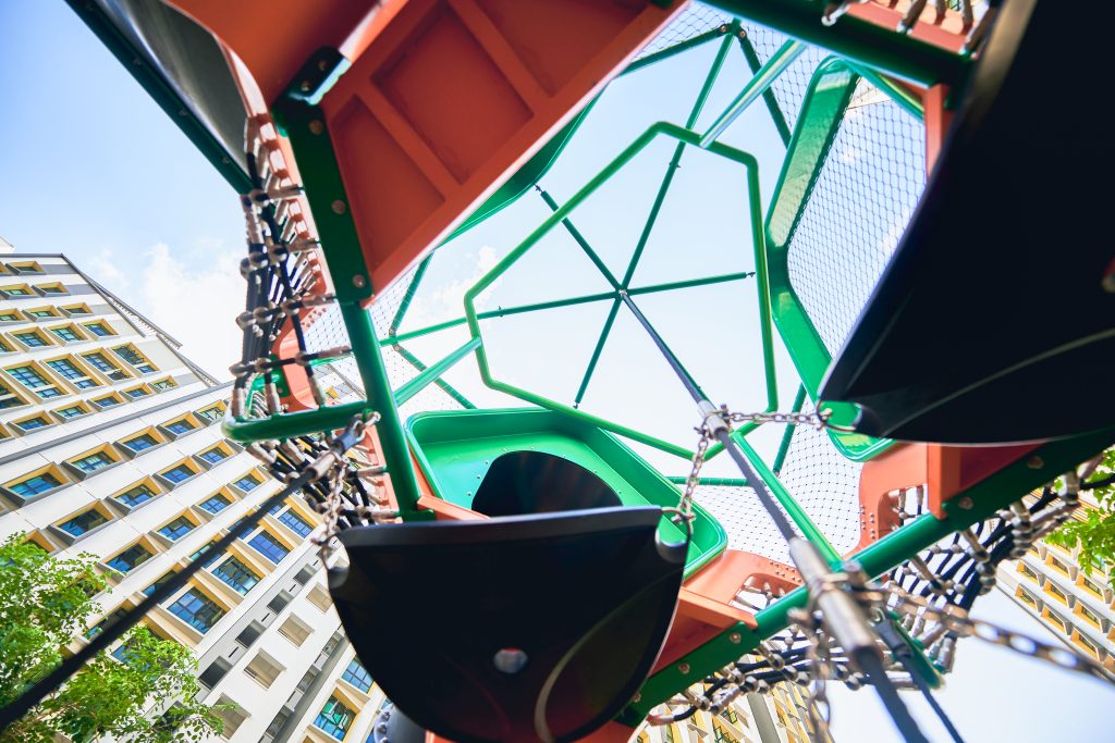 Inspired by the majestic form of banyan trees, this modern play tower at Tampines GreenGem reimagines nature as an exciting adventure landmark for children. Finished in a bold, vibrant orange, it instantly becomes a striking focal point within any playground, capturing children’s attention and inviting exploration. Each tower features its own slide, delivering thrilling descents for older children seeking excitement and adventure. Blending nature-inspired design with contemporary styling, the structure supports children’s coordination, courage, and imaginative play.