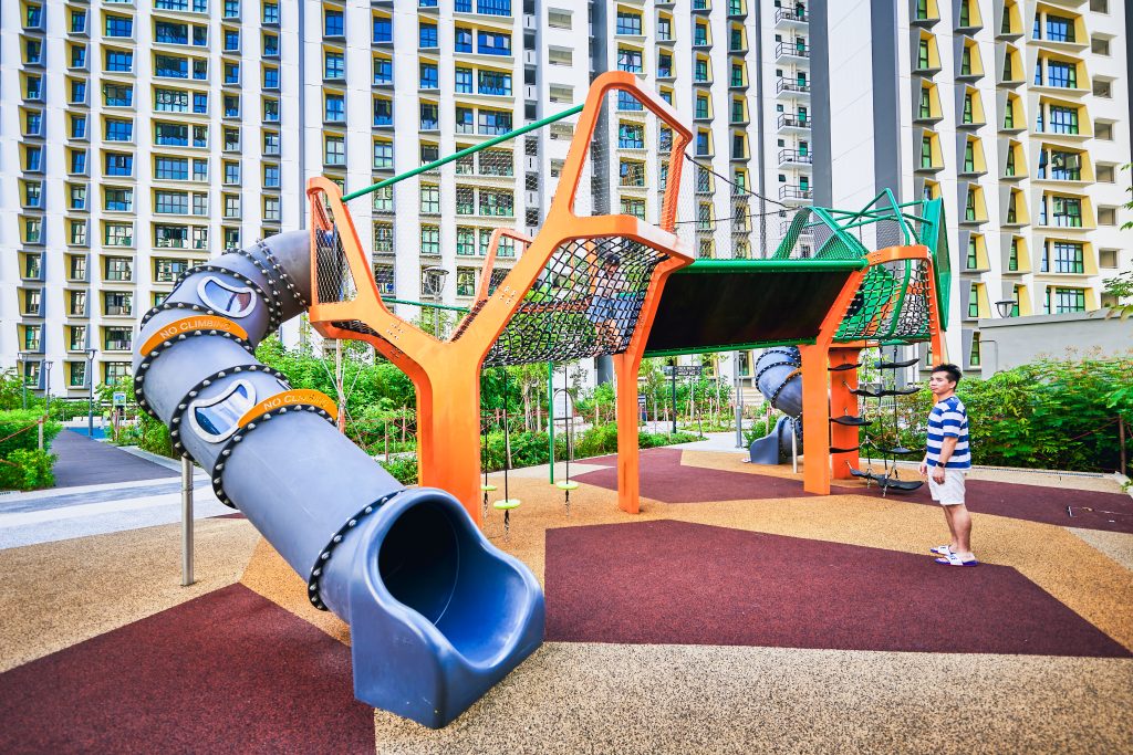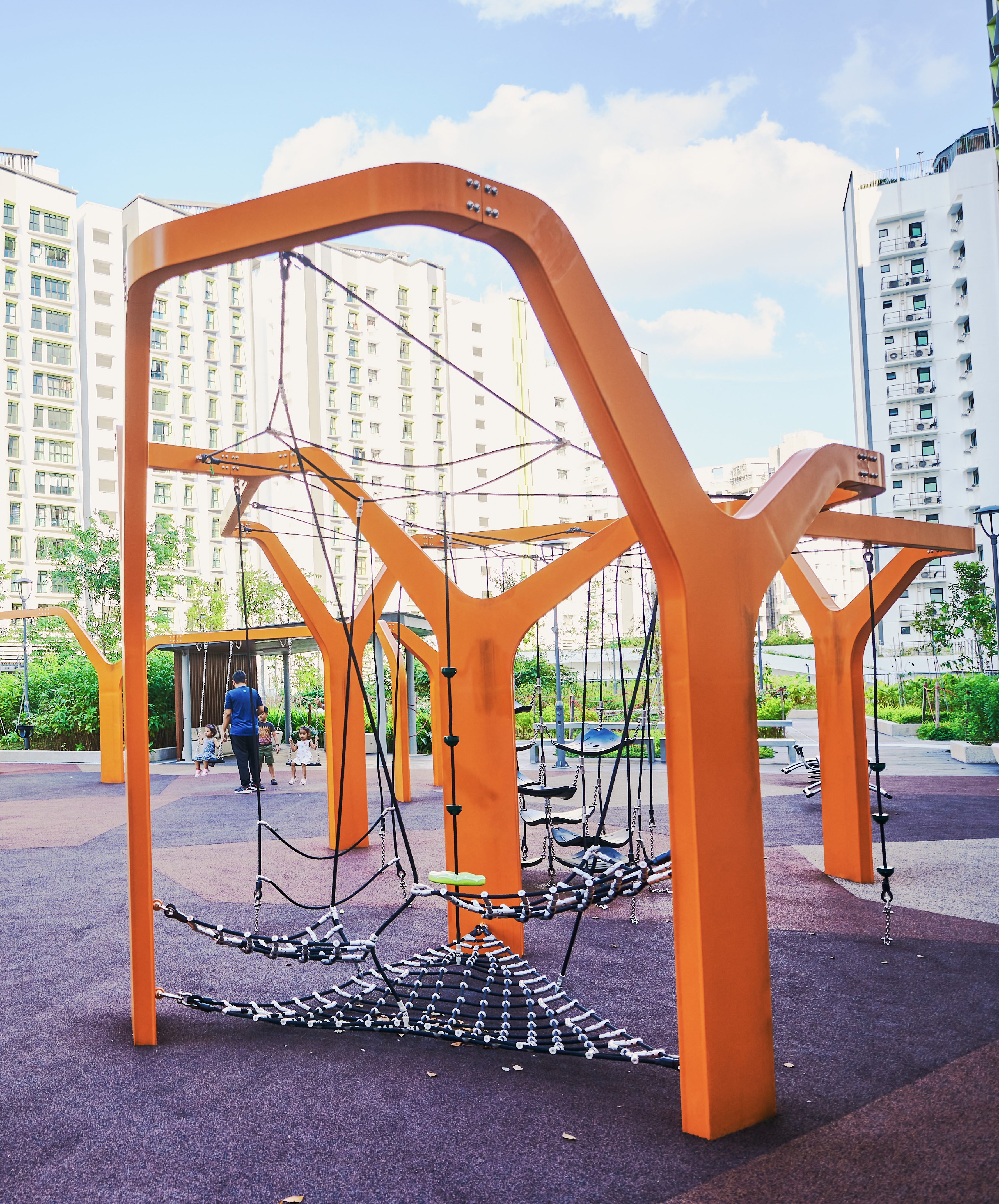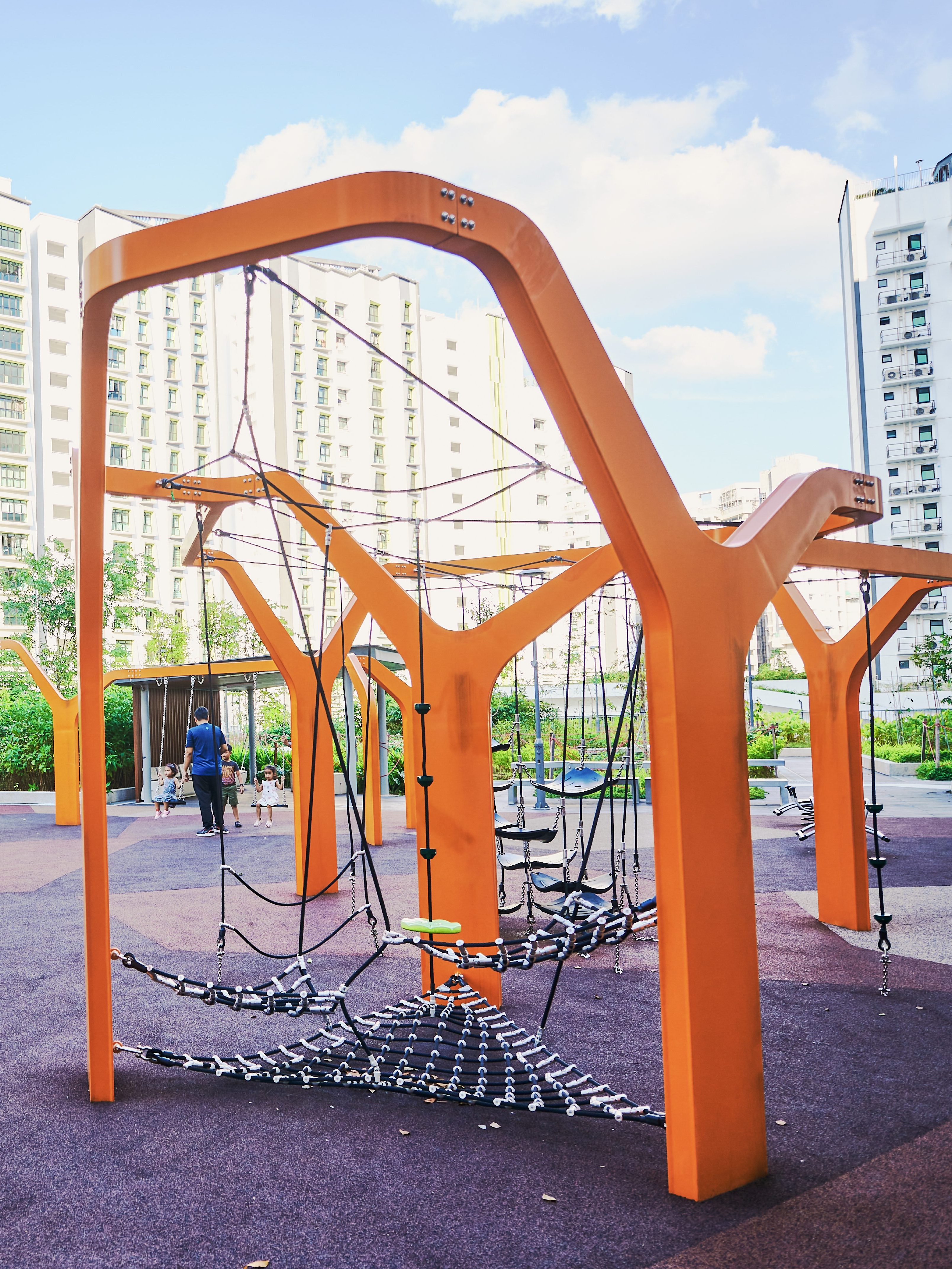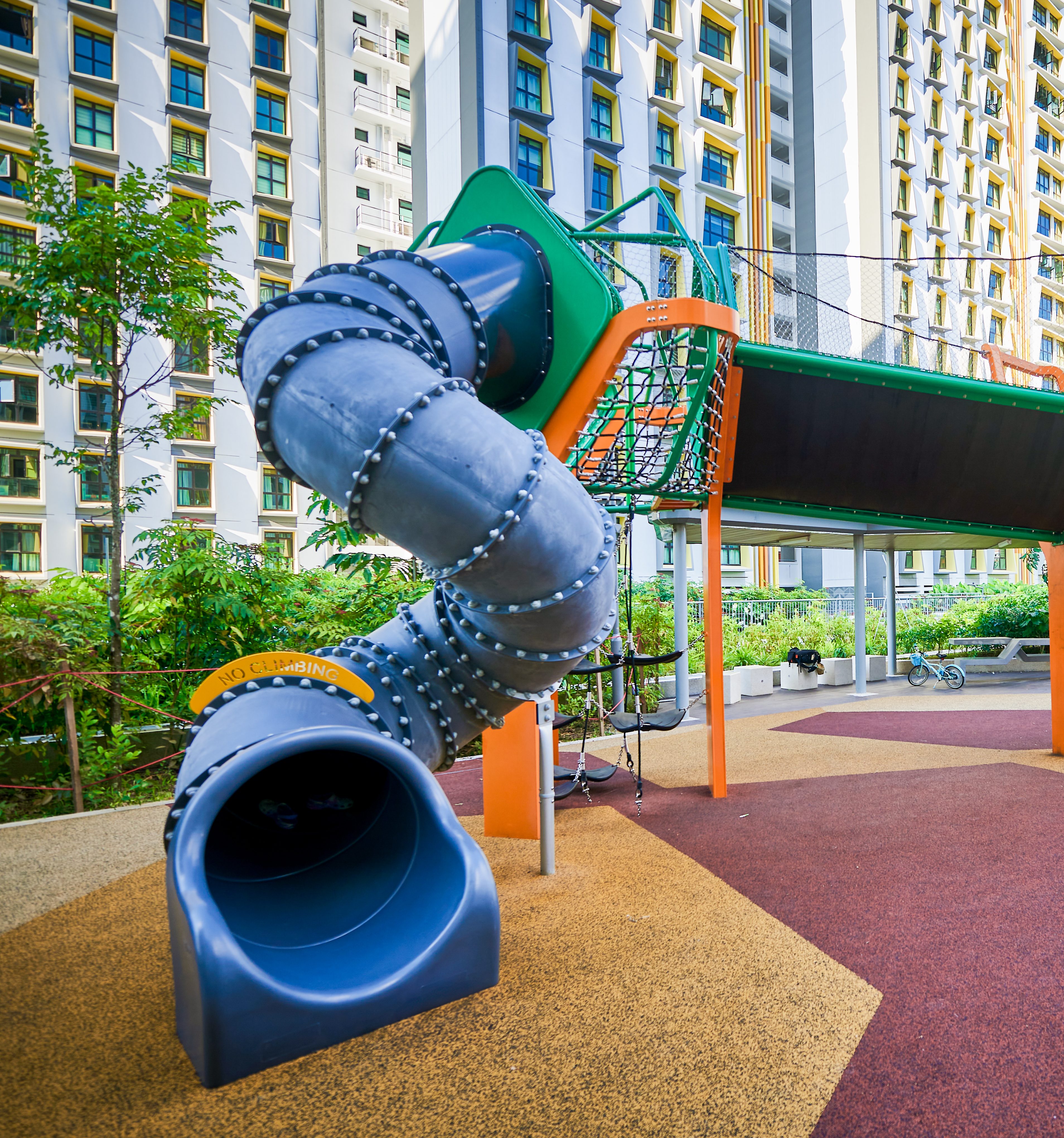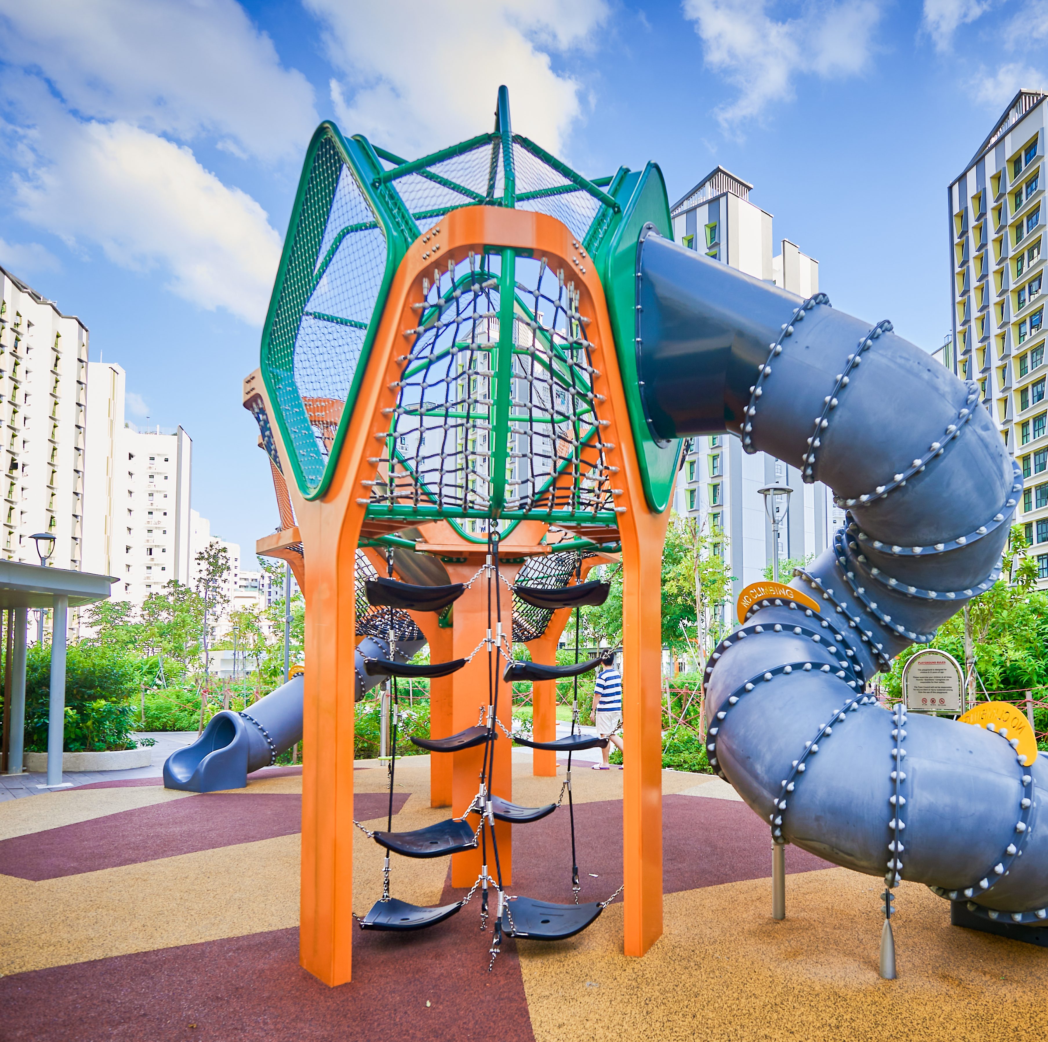 Inspired by the majestic form of banyan trees, this modern play tower at Tampines GreenGem reimagines nature as an exciting adventure landmark for children. Finished in a bold, vibrant orange, it instantly becomes a striking focal point within any playground, capturing children’s attention and inviting exploration. Each tower features its own slide, delivering thrilling descents for older children seeking excitement and adventure. Blending nature-inspired design with contemporary styling, the structure supports children’s coordination, courage, and imaginative play.