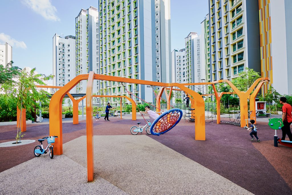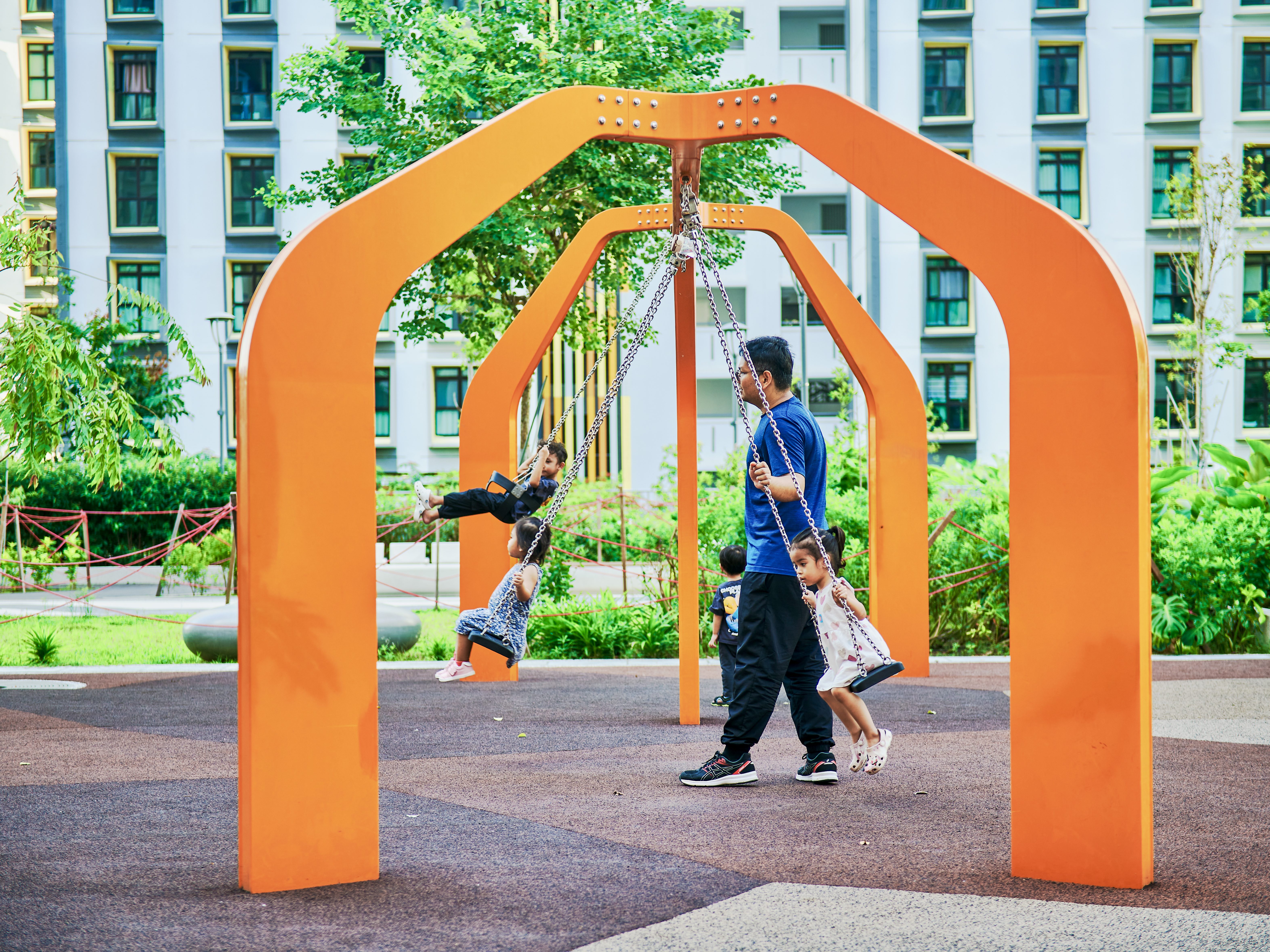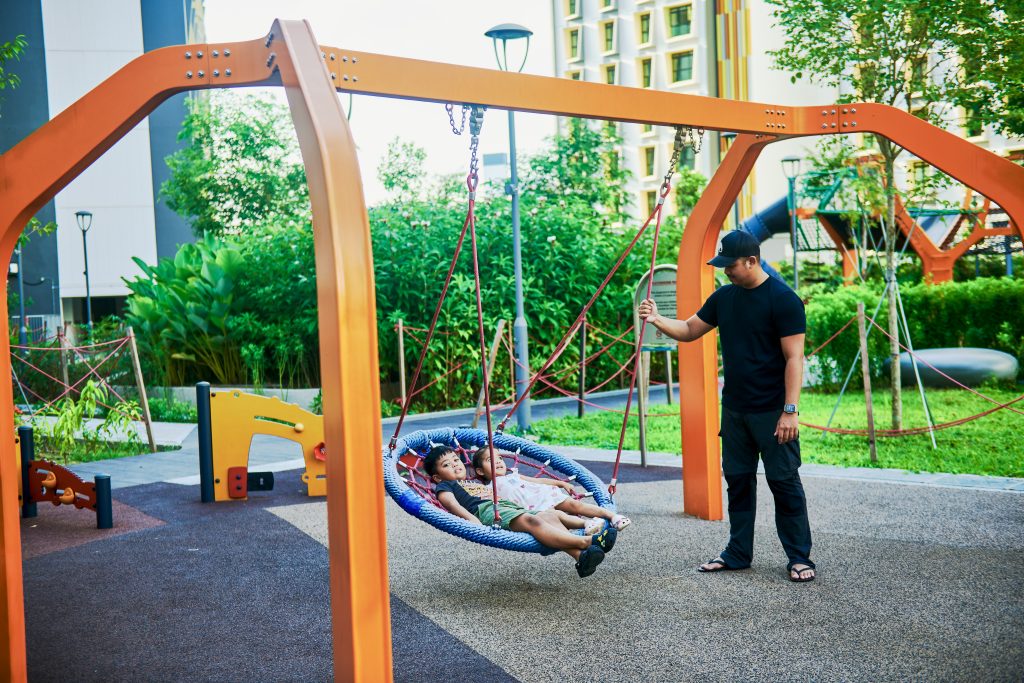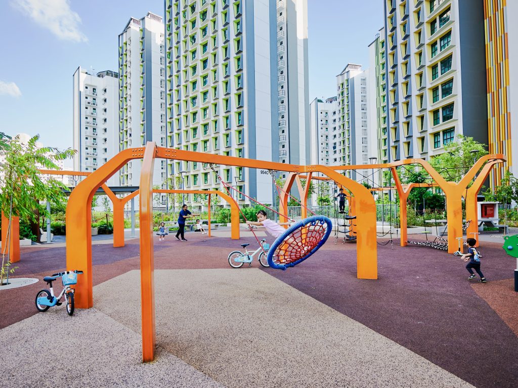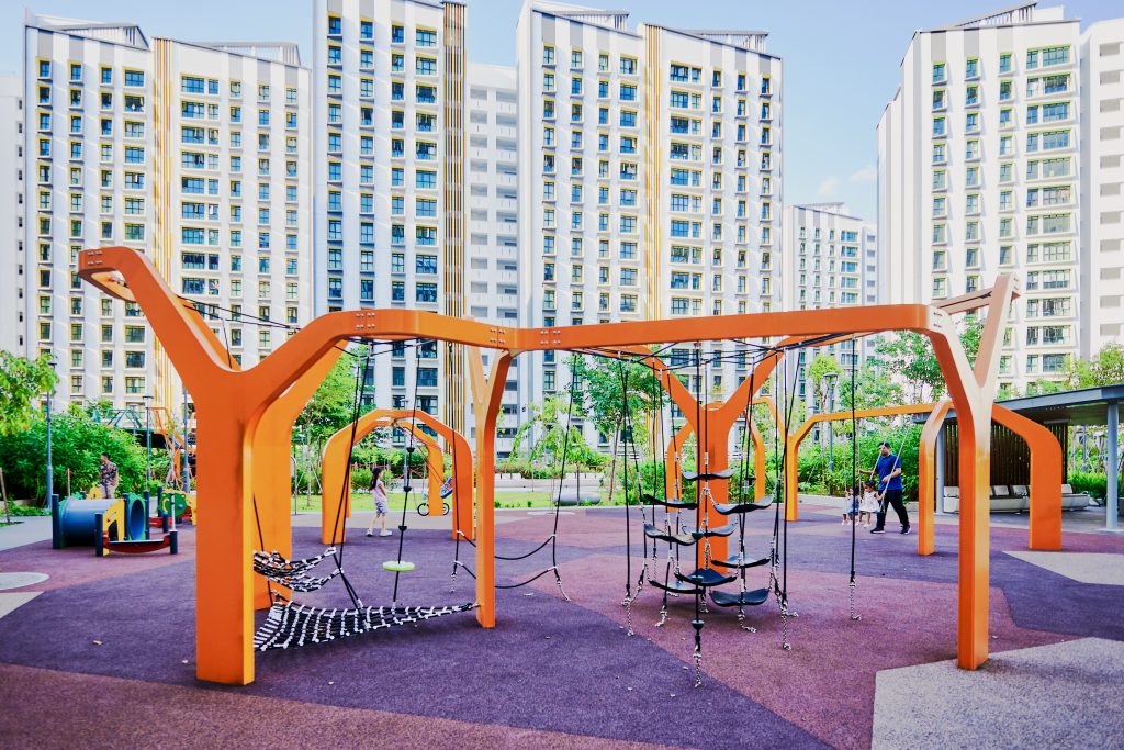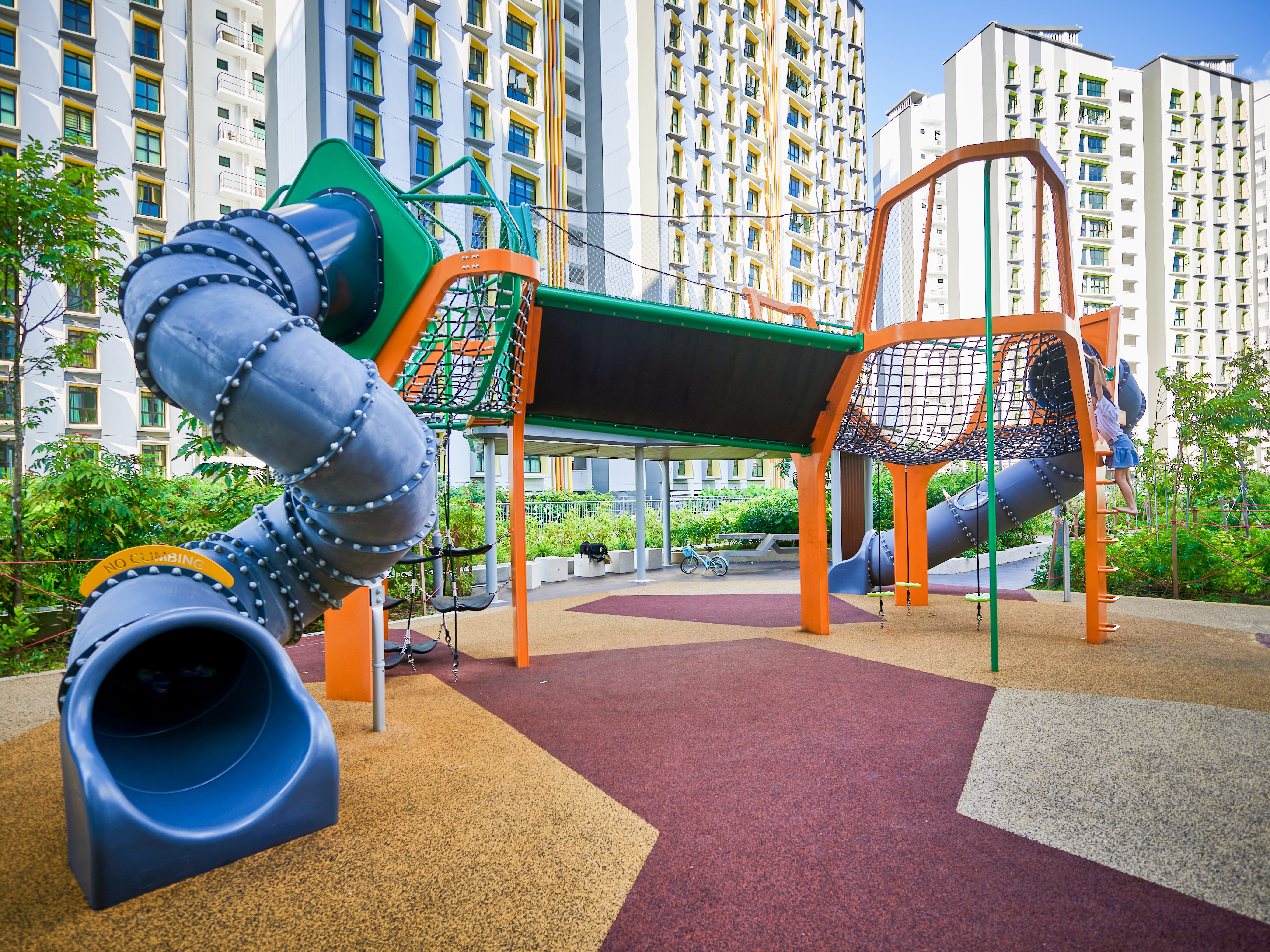 Inspired by the majestic form of banyan trees, this modern play tower at Tampines GreenGem reimagines nature as an exciting adventure landmark for children. Finished in a bold, vibrant orange, it instantly becomes a striking focal point within any playground, capturing children’s attention and inviting exploration. Each tower features its own slide, delivering thrilling descents for older children seeking excitement and adventure. Blending nature-inspired design with contemporary styling, the structure supports children’s coordination, courage, and imaginative play.